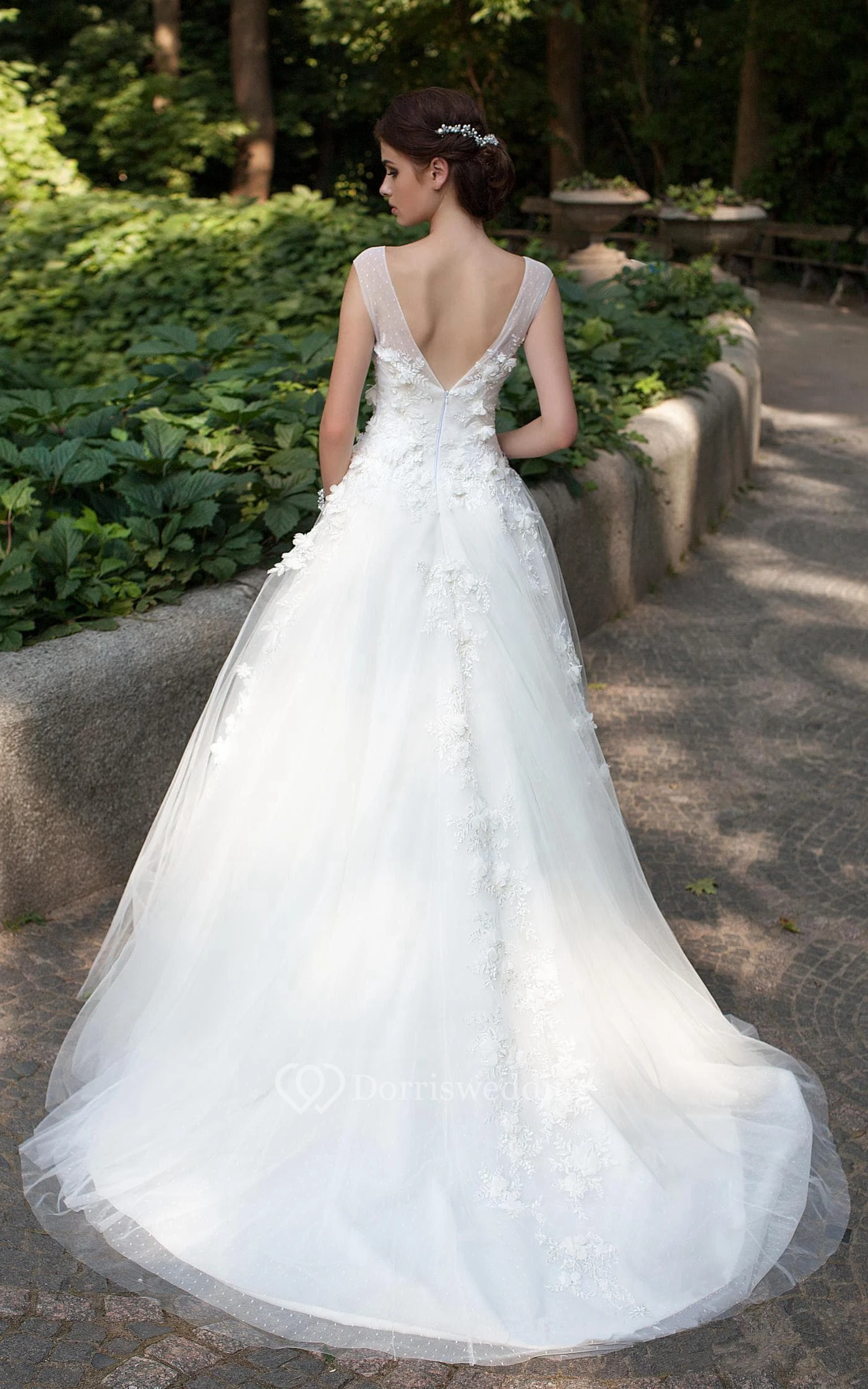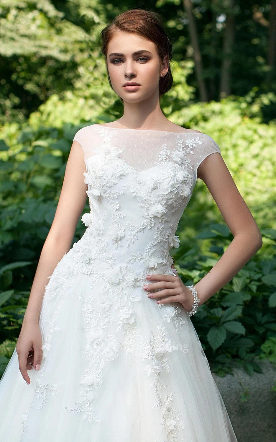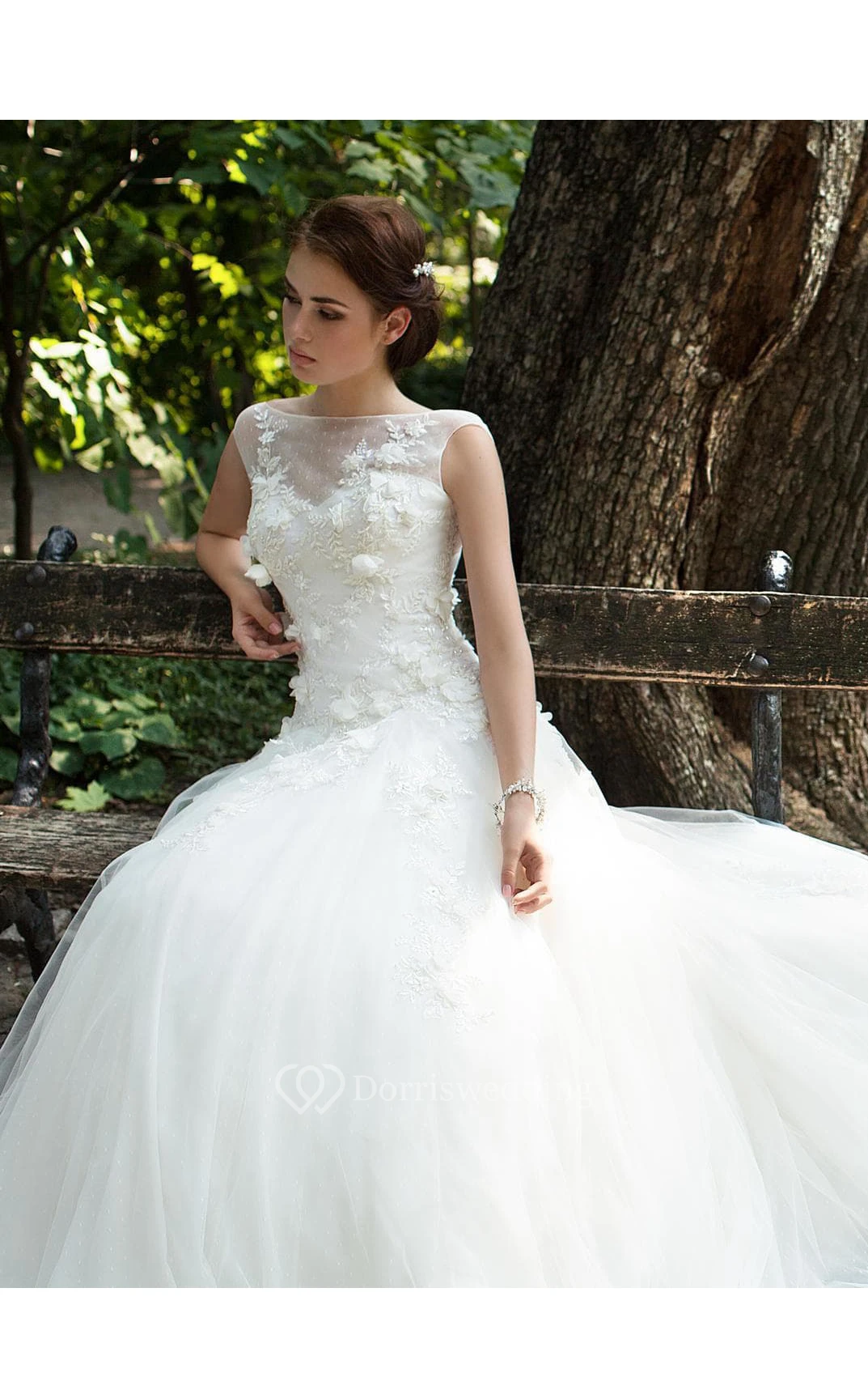 Ball Gown Maxi Bateau Cap-Sleeve Deep-V-Back Tulle Dress With Appliques And Flower