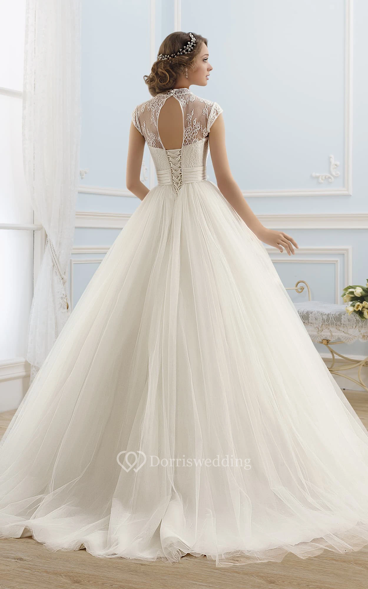 Ball Gown Maxi High-Neck Sleeveless Illusion Satin Dress With Lace