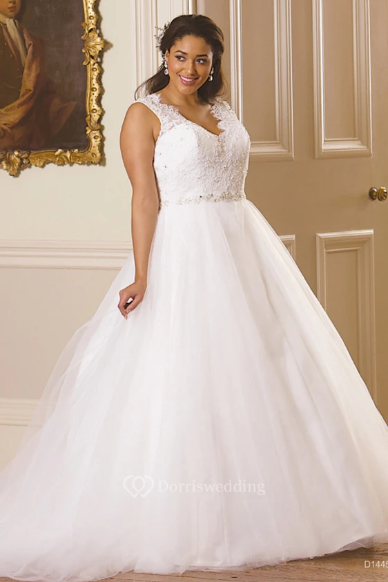 Ball Gown Maxi Sleeveless V-Neck Jeweled Tulle Plus Size Wedding Dress Styles With Appliques And Illusion