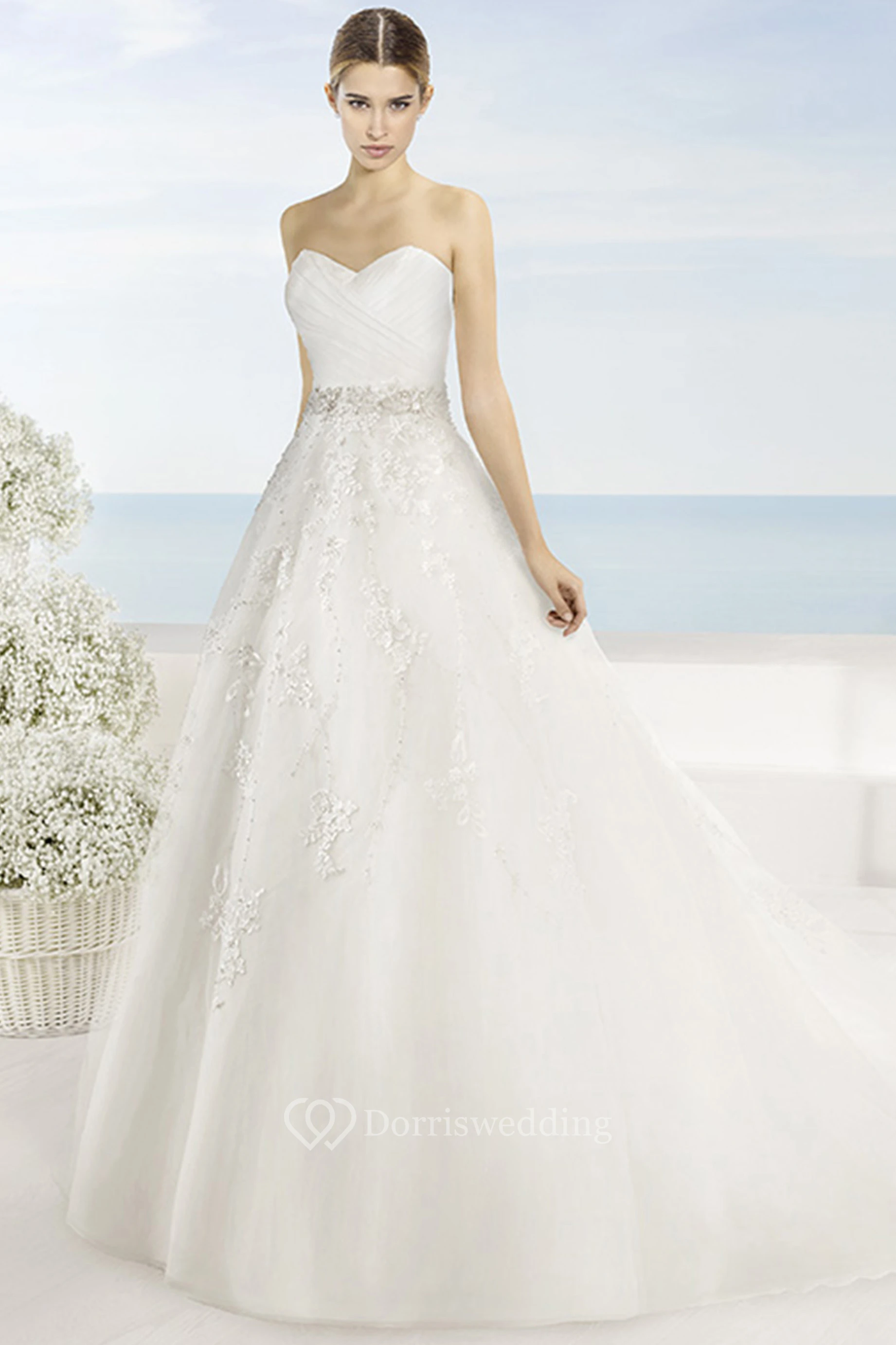 Ball Gown Maxi Sweetheart Jeweled Tulle Wedding Dress With Criss Cross And Appliques