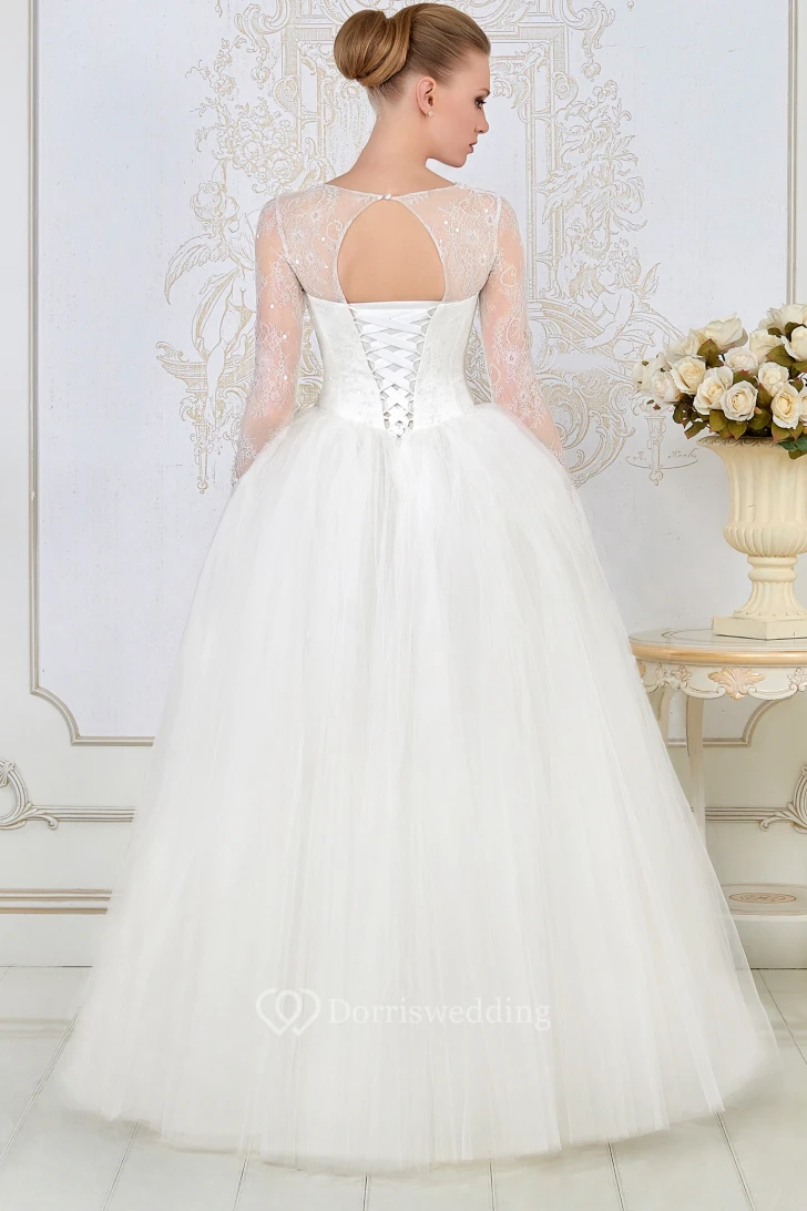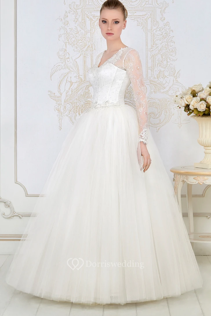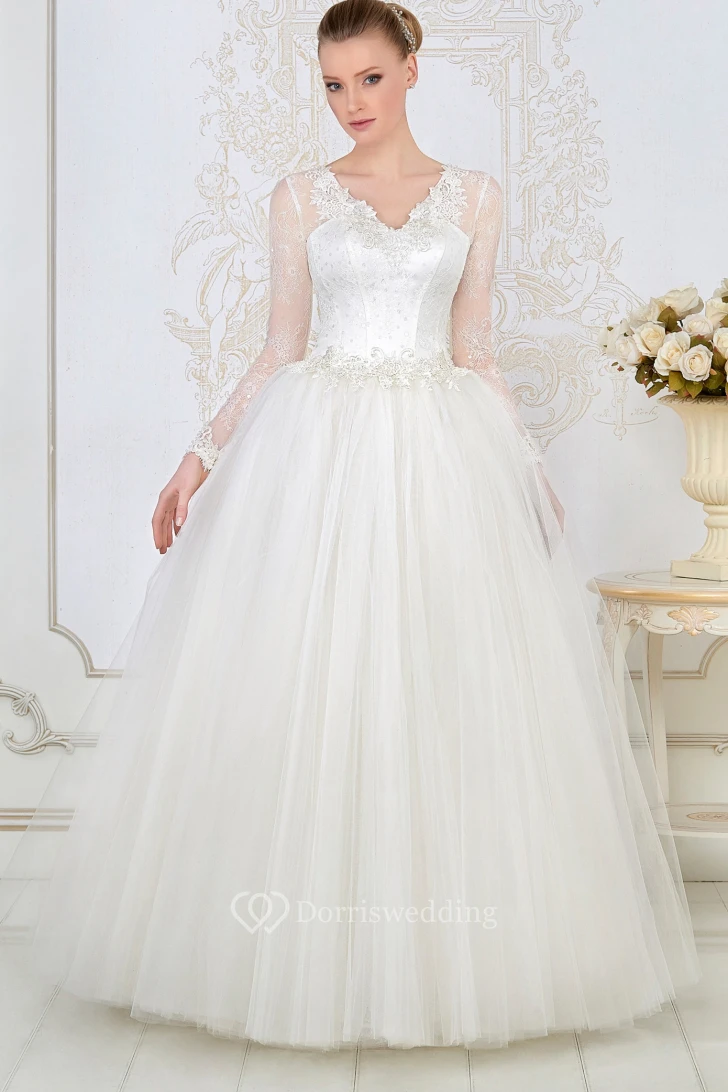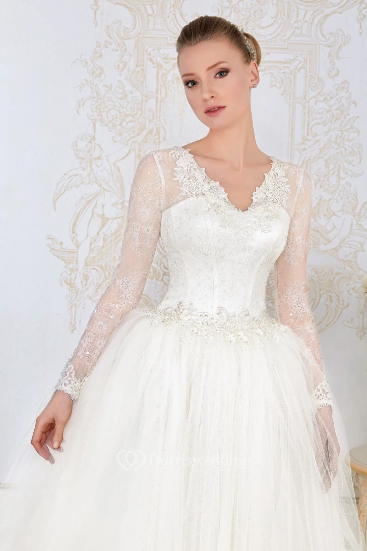 Ball Gown Maxi V-Neck Lace Long-Sleeve Tulle Wedding Dress With Appliques And Beading
