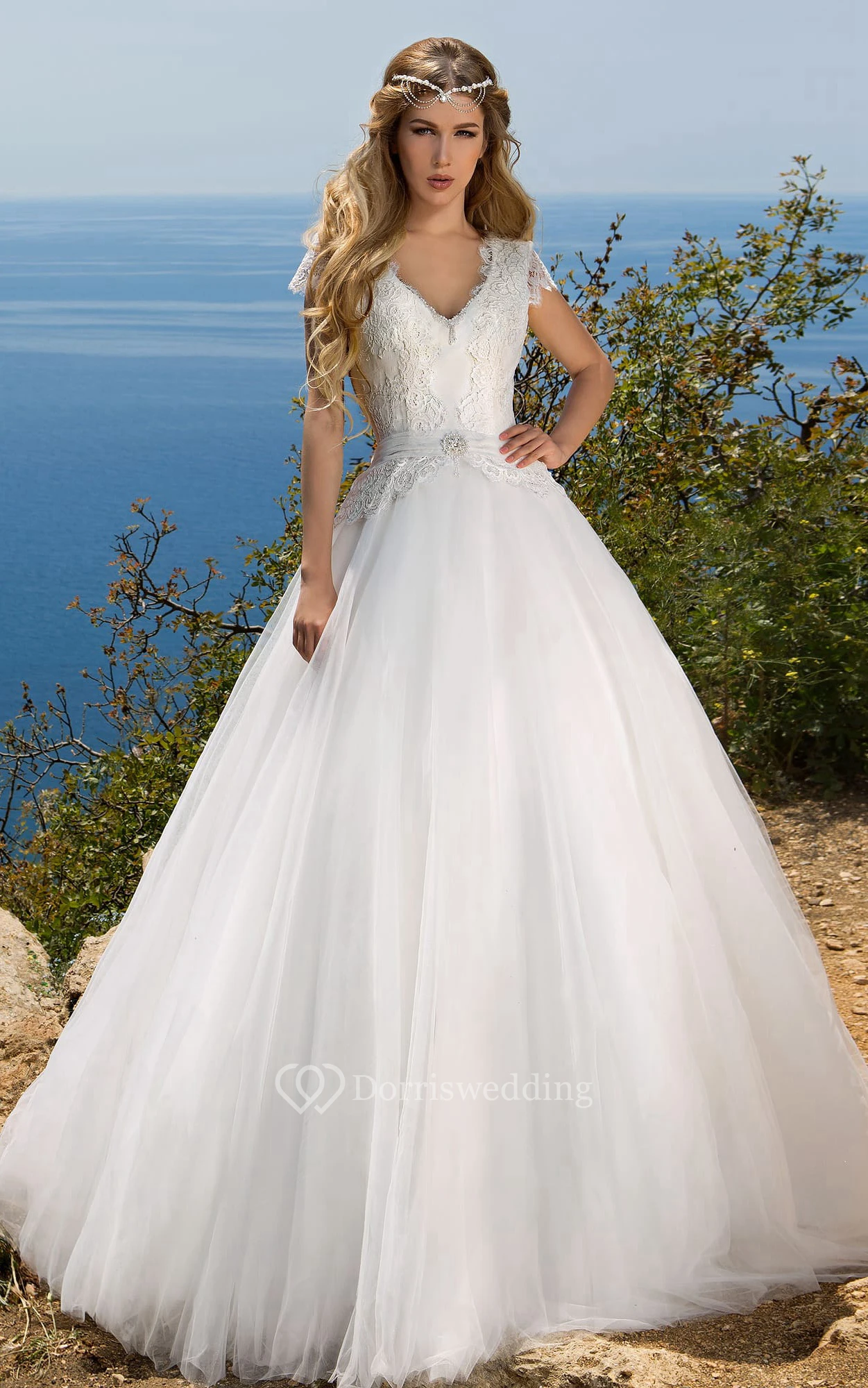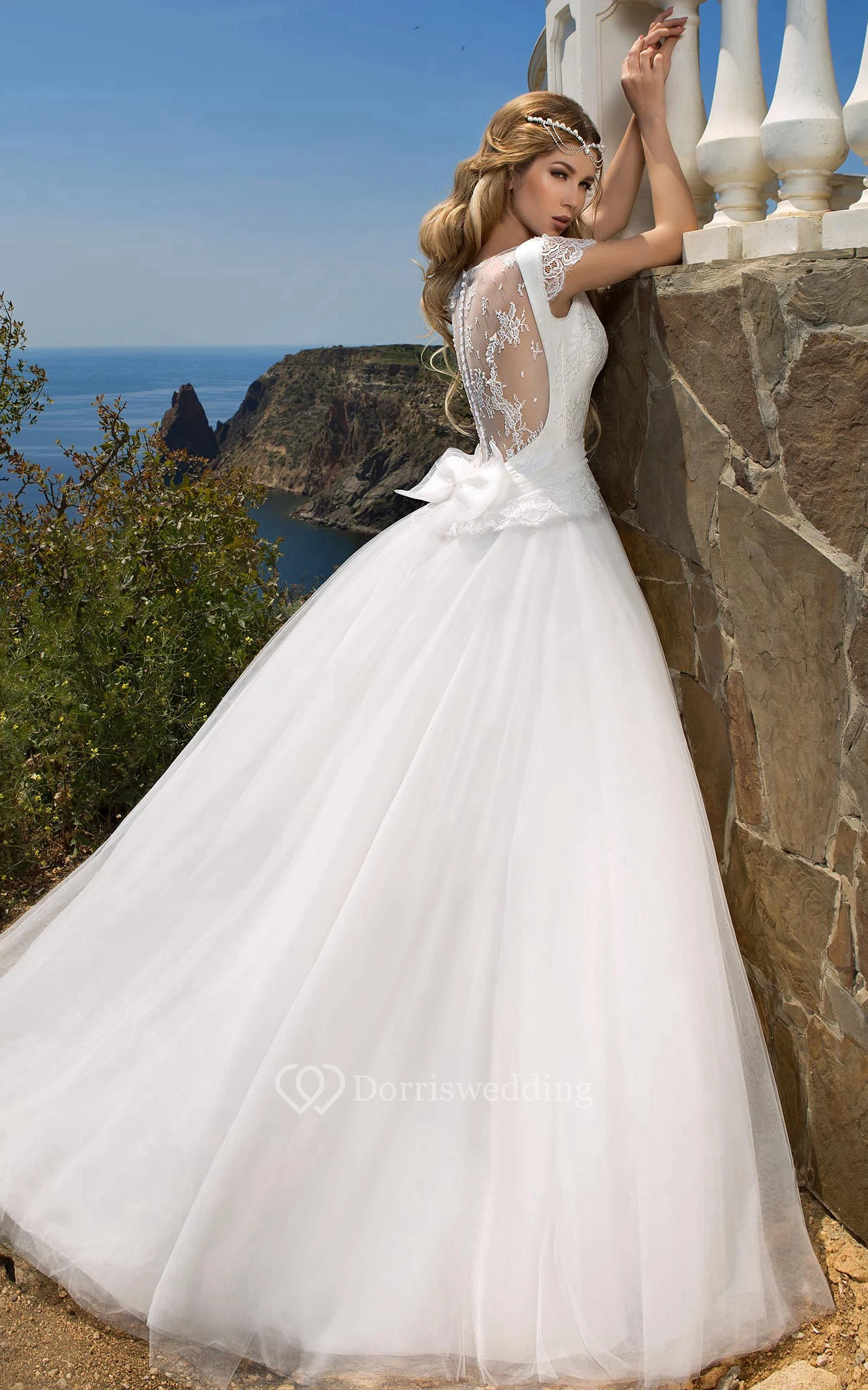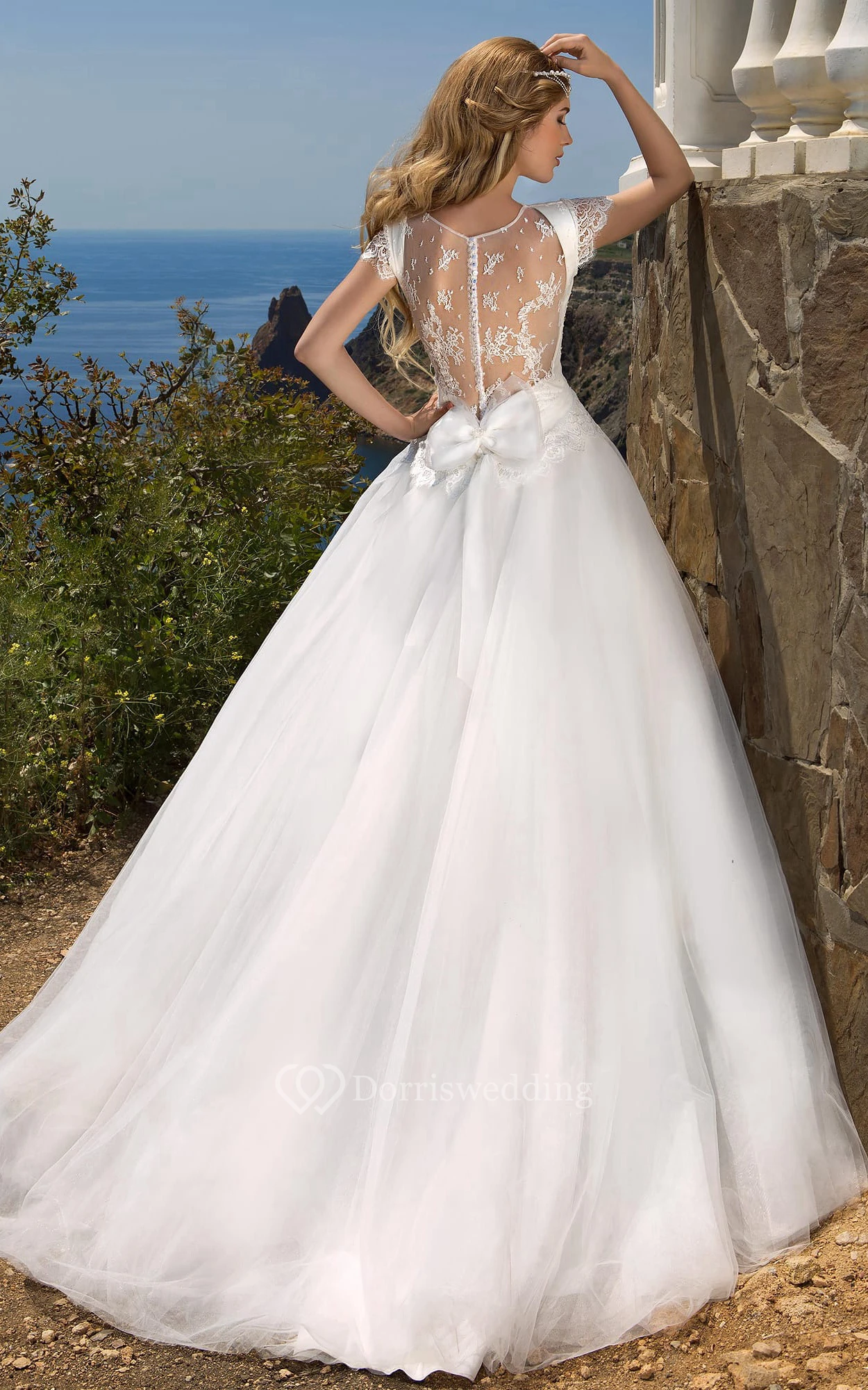 Ball Gown Maxi V-Neck Poet-Sleeve Illusion Tulle Dress With Lace And Bow