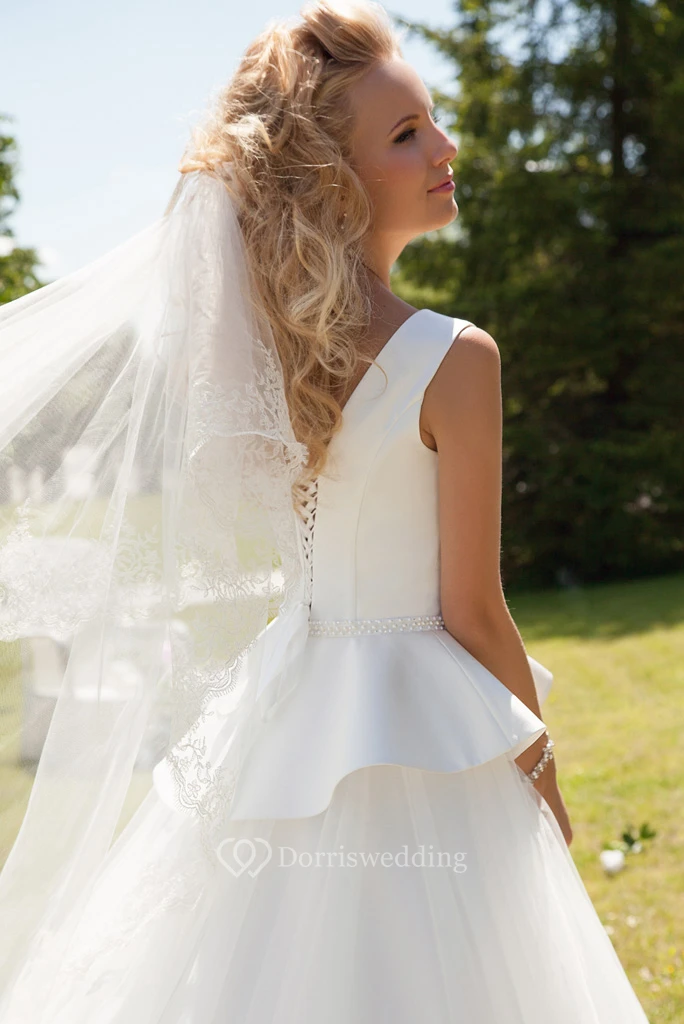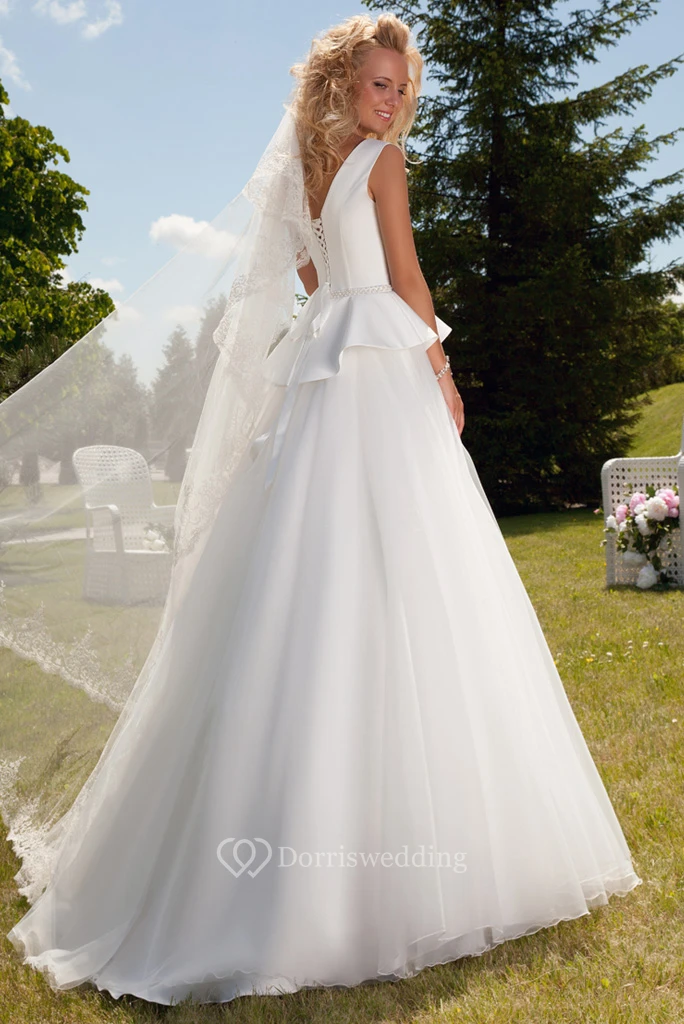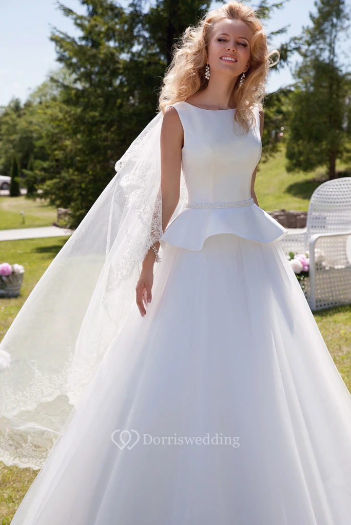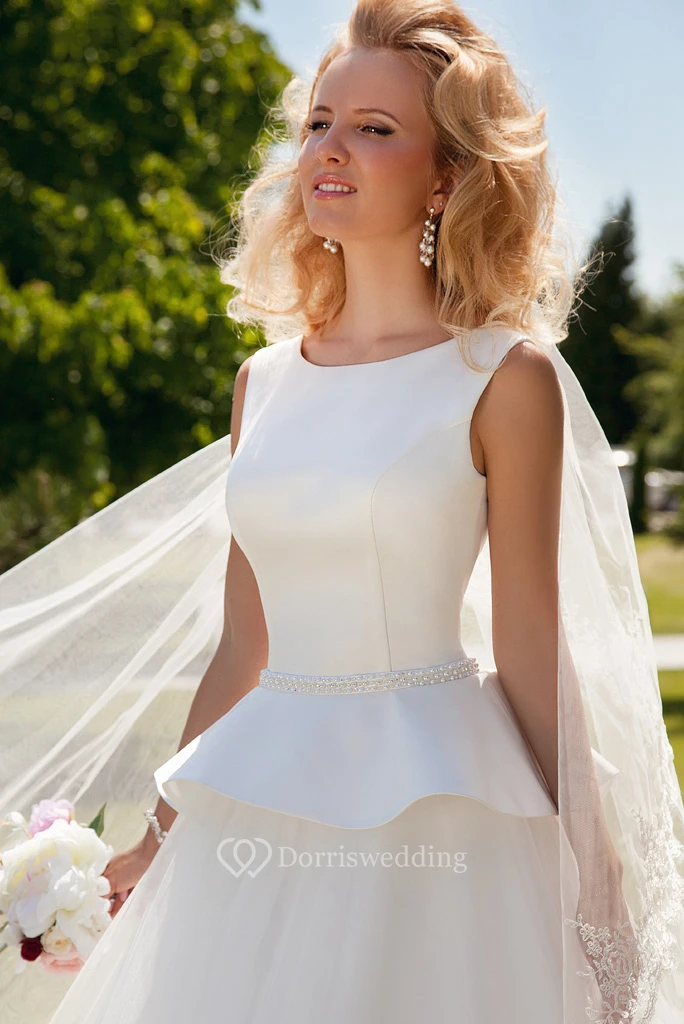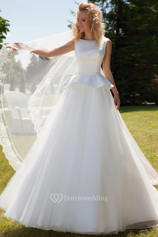 Ball-Gown Peplum Sleeveless Scoop Floor-Length Satin&Tulle Wedding Dress With Corset Back And Waist Jewellery