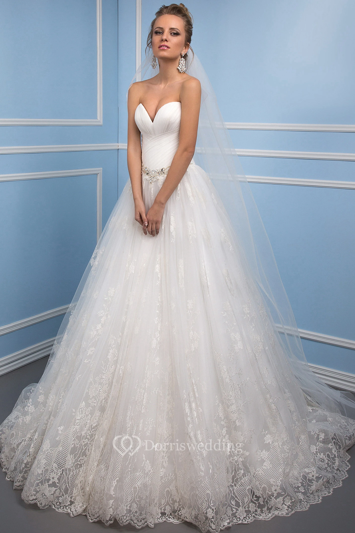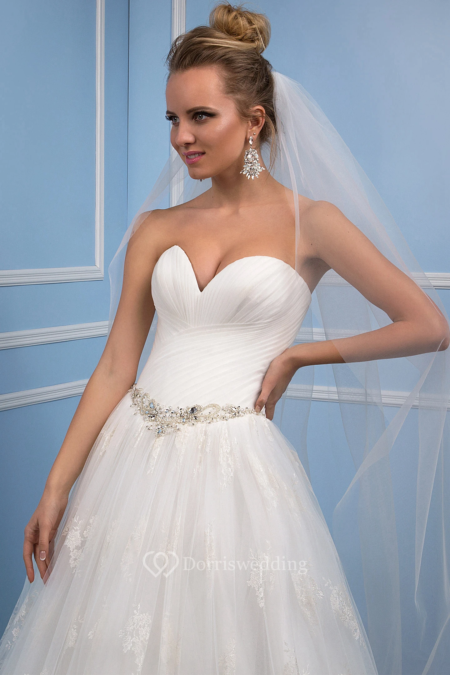 Ball Gown Ruched Sweetheart Tulle Wedding Dress With Waist Jewellery
