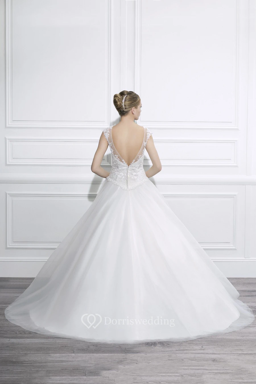 Ball Gown Scoop-Neck Long Cap-Sleeve Tulle Wedding Dress With Appliques And Deep-V Back
