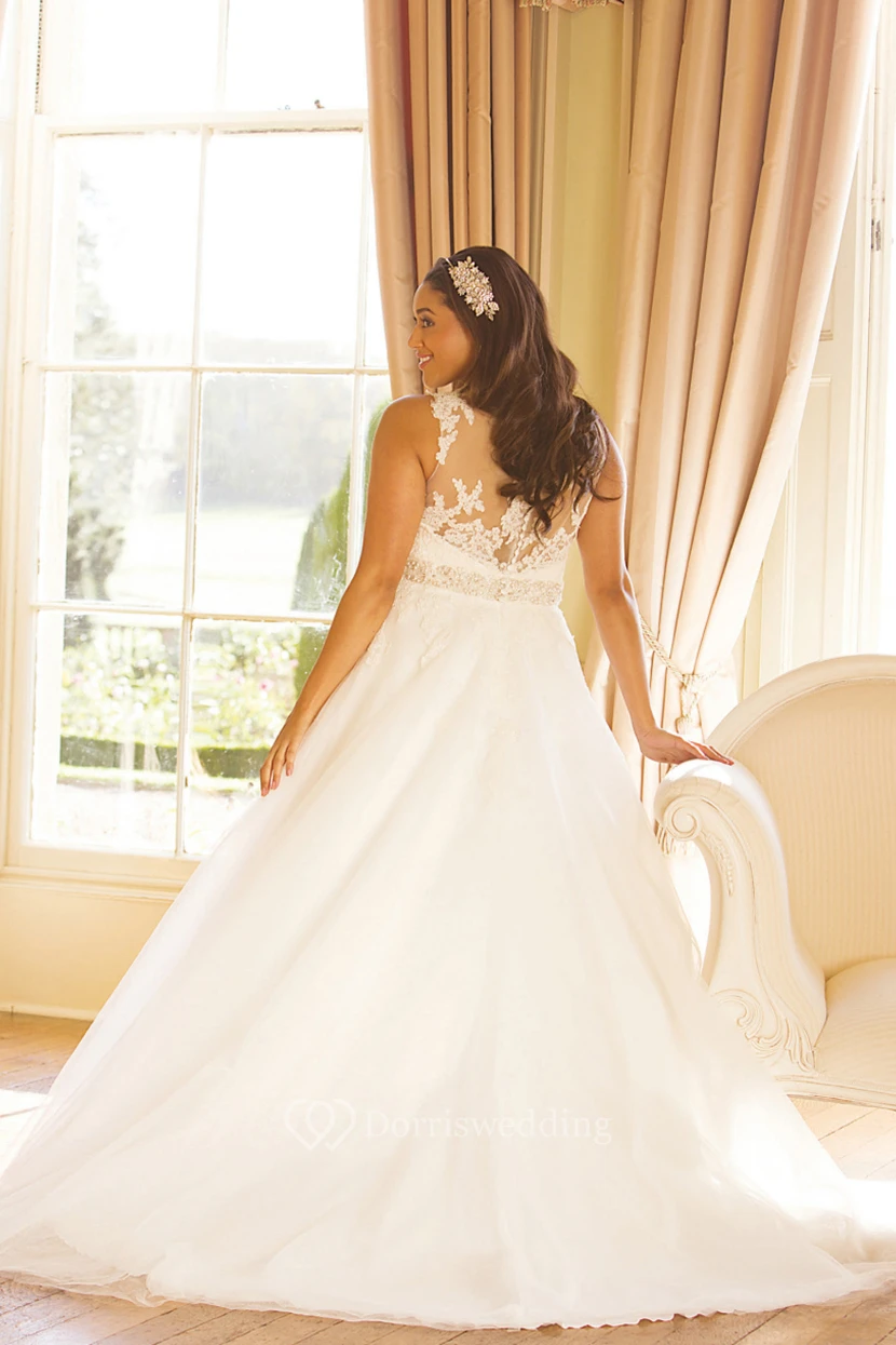 Ball Gown Scoop-Neck Sleeveless Long Jeweled Tulle Plus Size Wedding Dress With Appliques And Illusion