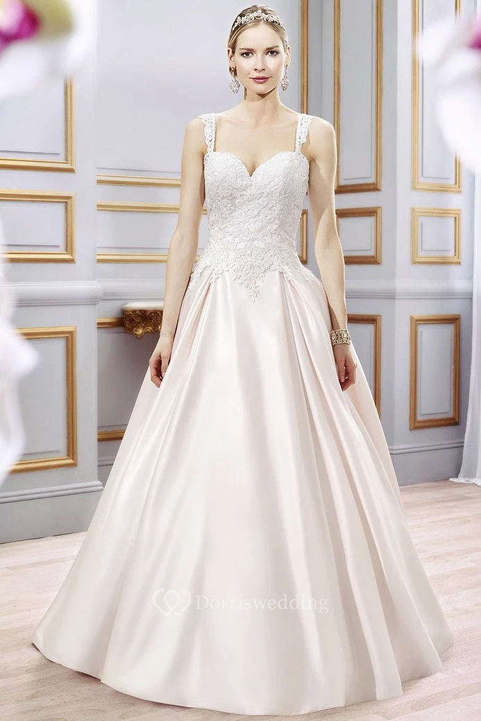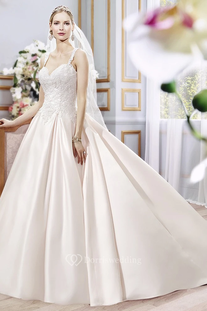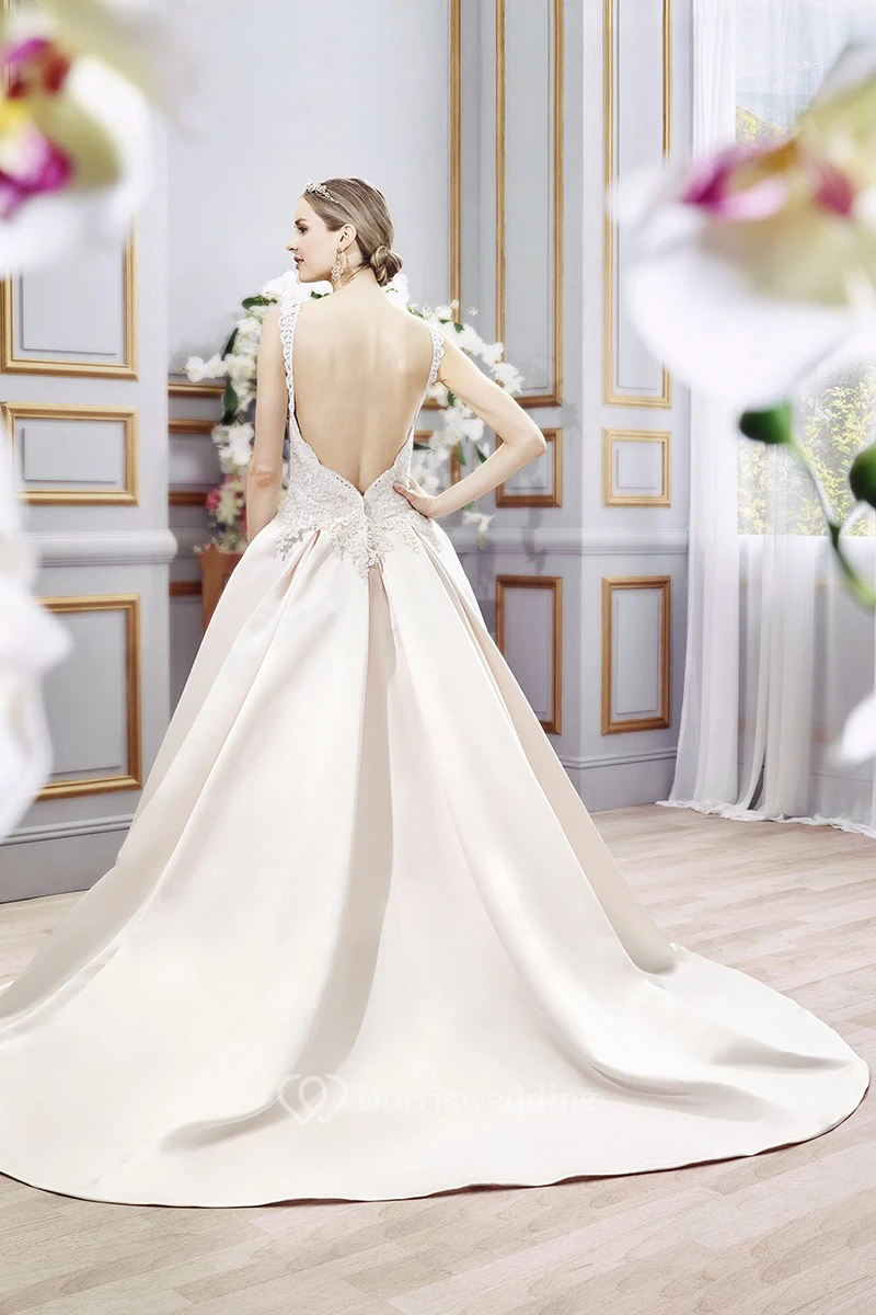 Ball-Gown Sleeveless Appliqued Floor-Length Satin&Lace Wedding Dress With Court Train And Backless Style