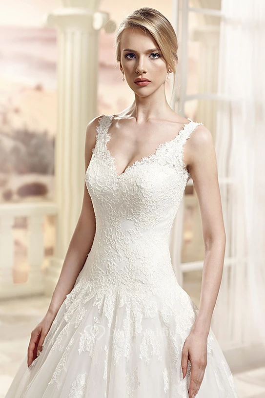 Ball Gown Sleeveless Appliqued Long V-Neck Tulle Wedding Dress