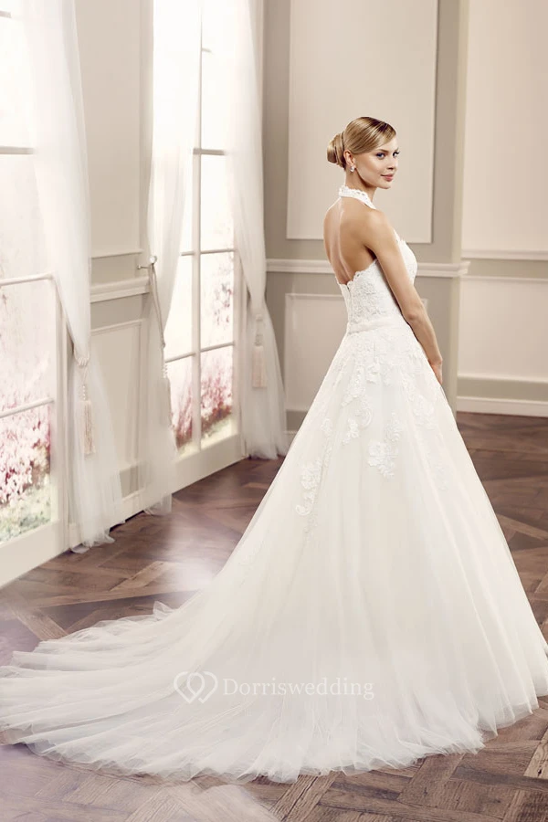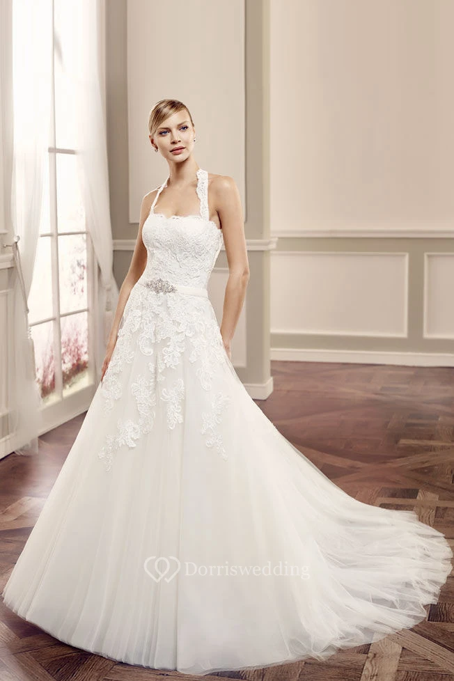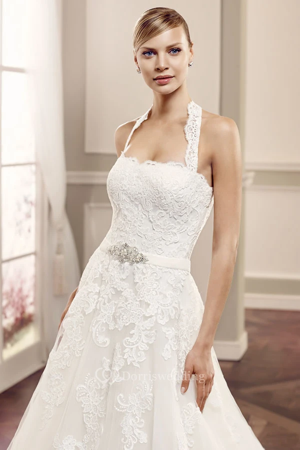 Ball-Gown Sleeveless Floor-Length Halter Appliqued Lace Wedding Dress With Waist Jewellery
