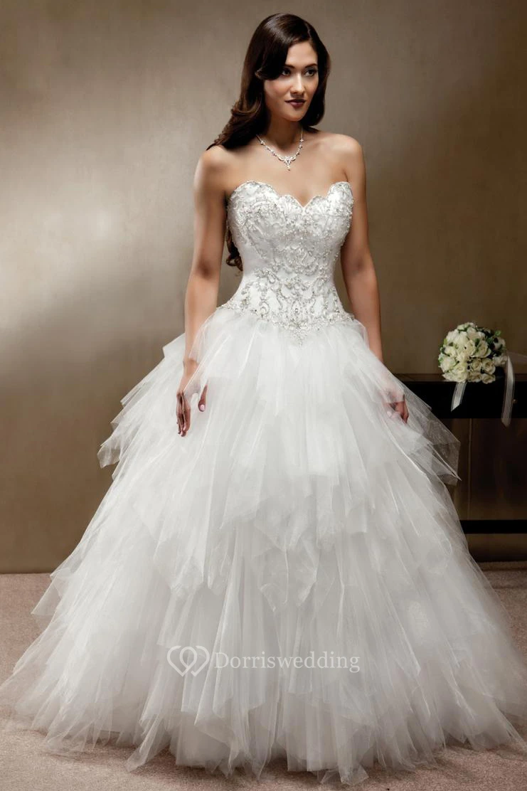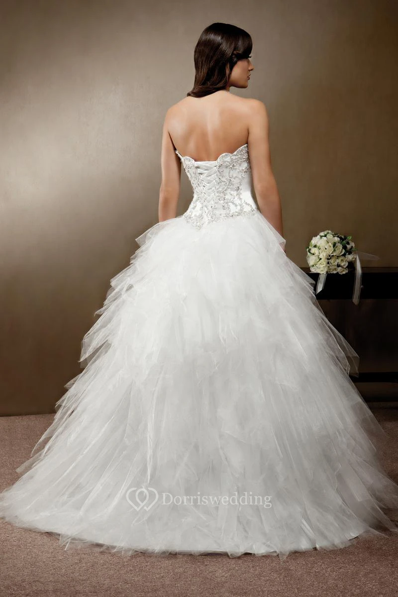 Ball-Gown Sleeveless Long Sweetheart Cascading-Ruffle Tulle Wedding Dress With Beading And Corset Back