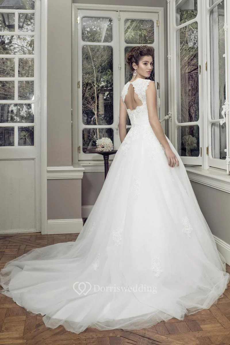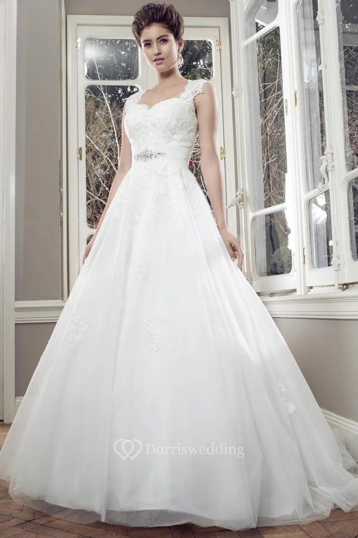 Ball-Gown Sleeveless Maxi Appliqued Lace&Satin Wedding Dress With Waist Jewellery And Keyhole Back
