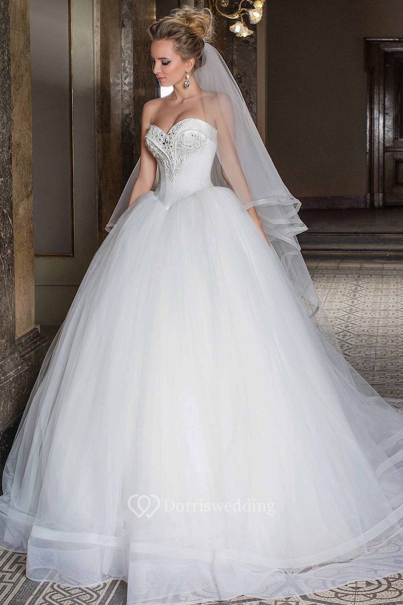 Ball Gown Sleeveless Sweetheart Beaded Tulle Wedding Dress With Court Train