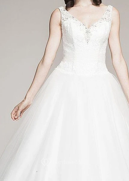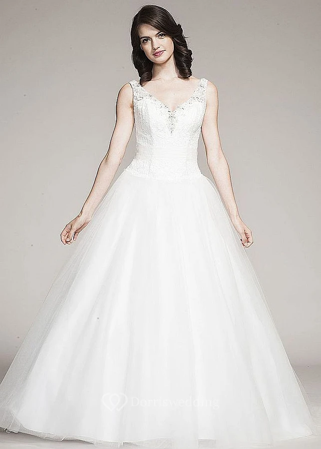 Ball Gown Sleeveless V-Neck Floor-Length Beaded Tulle&Lace Wedding Dress With Appliques
