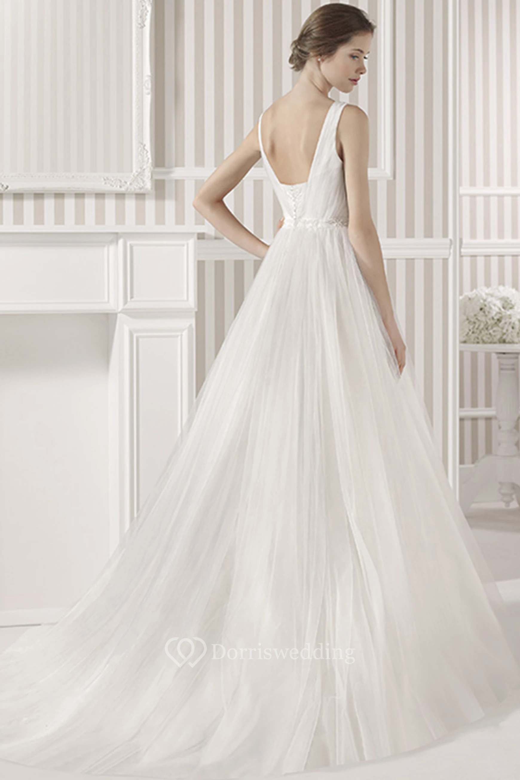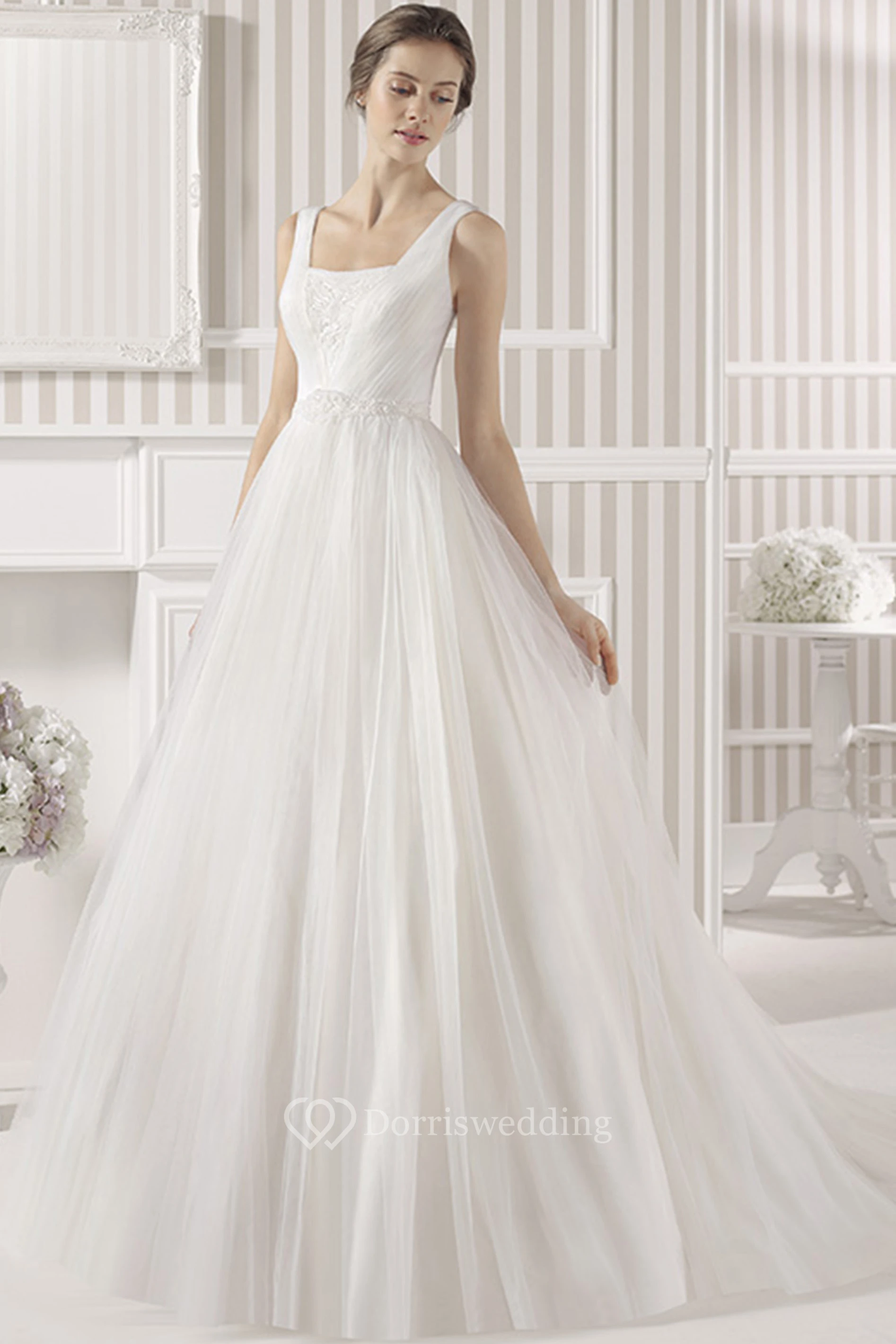Ball-Gown Square Appliqued Sleeveless Empire Maxi Tulle Wedding Dress With Court Train And Low-V Back