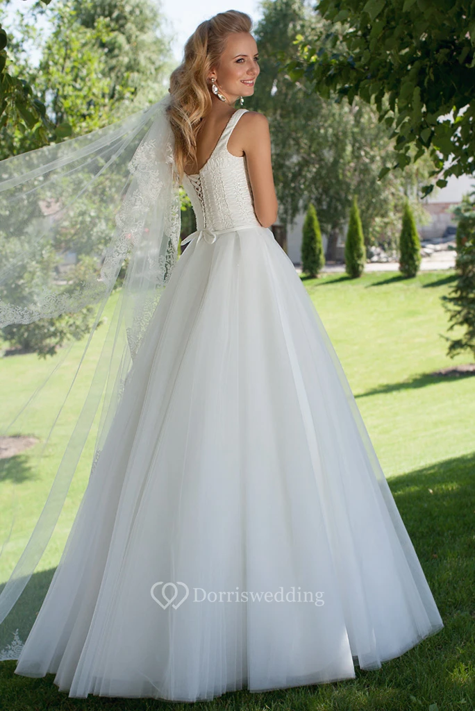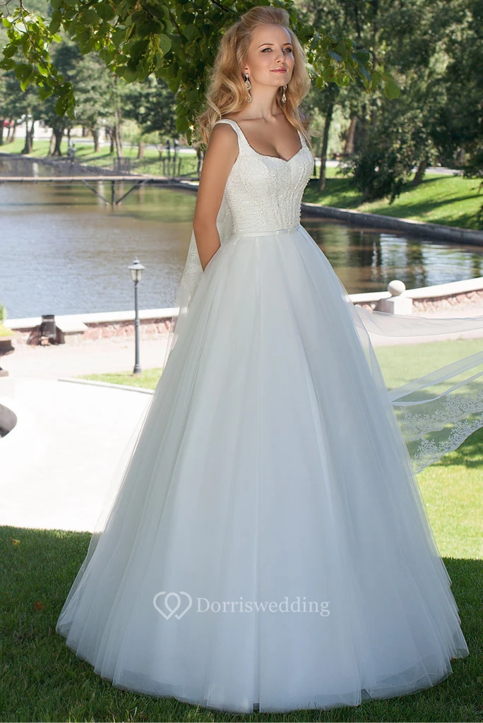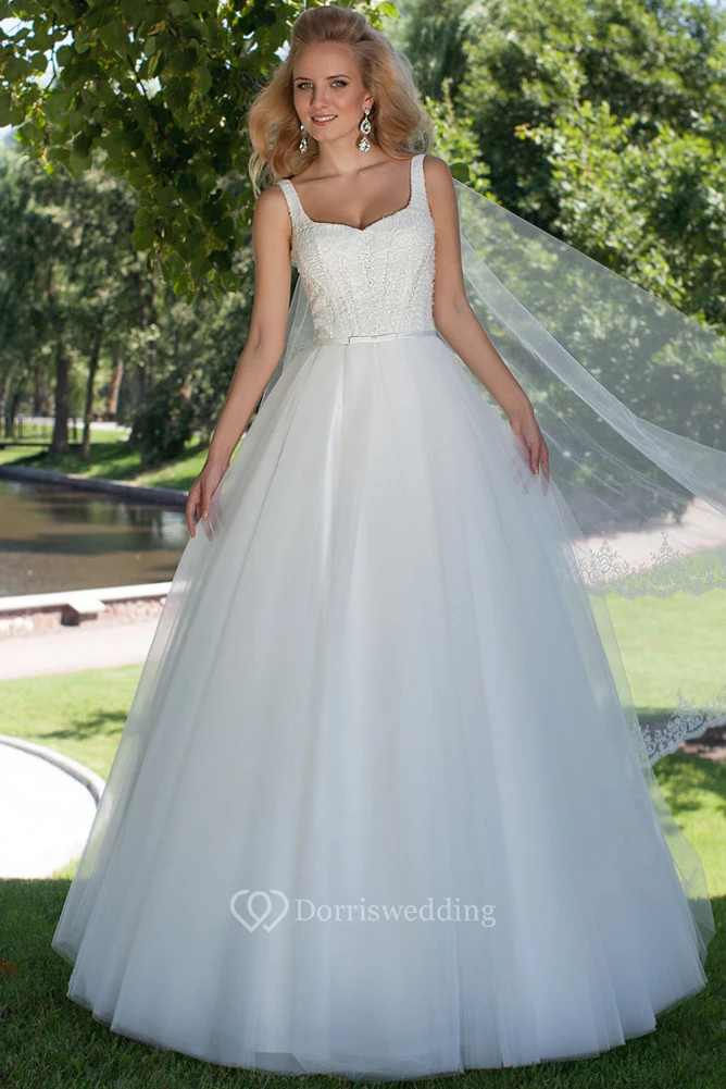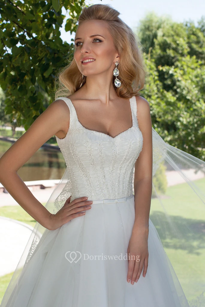 Ball-Gown Square Long Sleeveless Beaded Tulle Wedding Dress With Corset Back