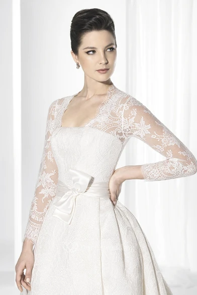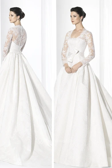 Ball Gown Square-Neck Floor-Length Long-Sleeve Lace Wedding Dress With Bow And Illusion
