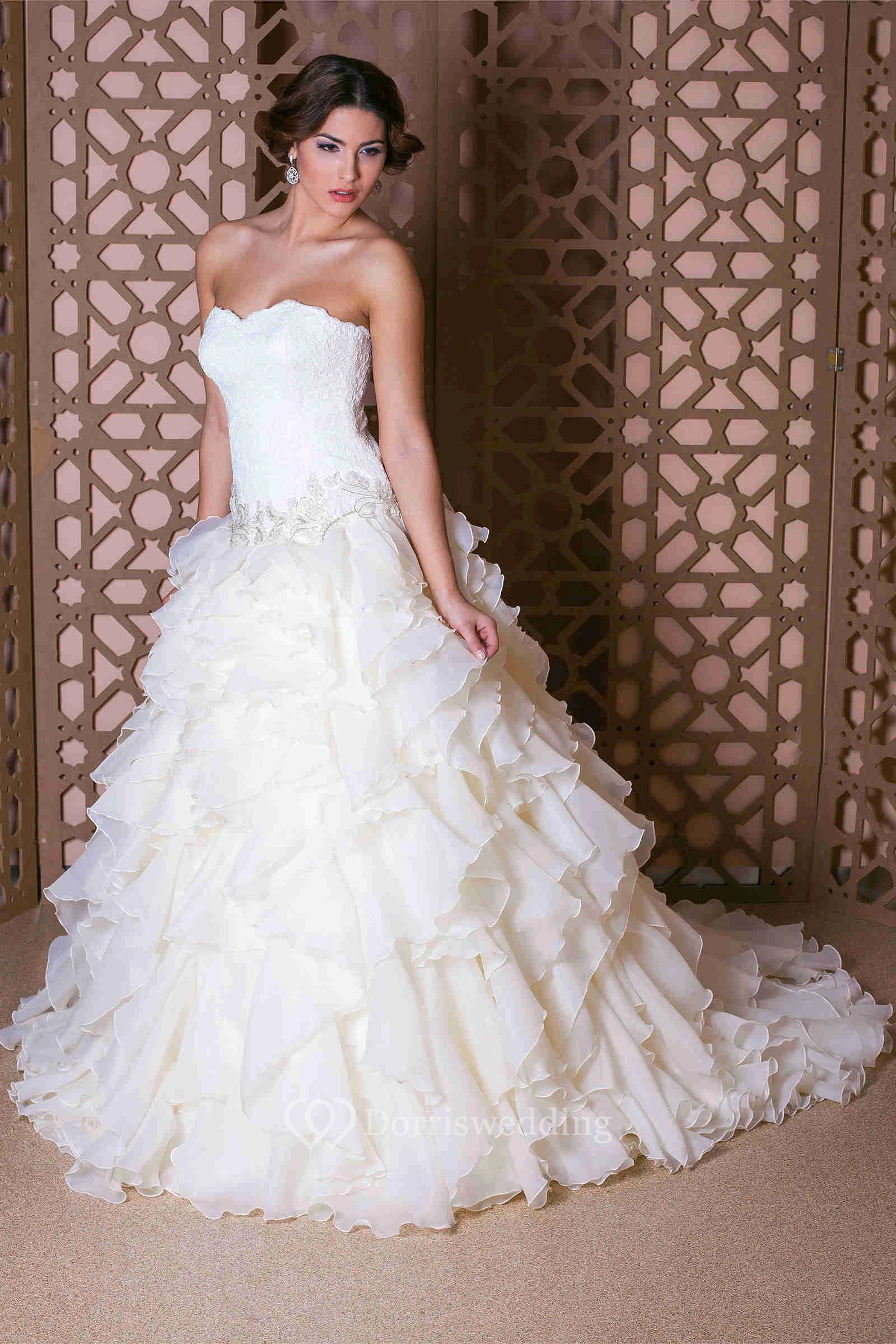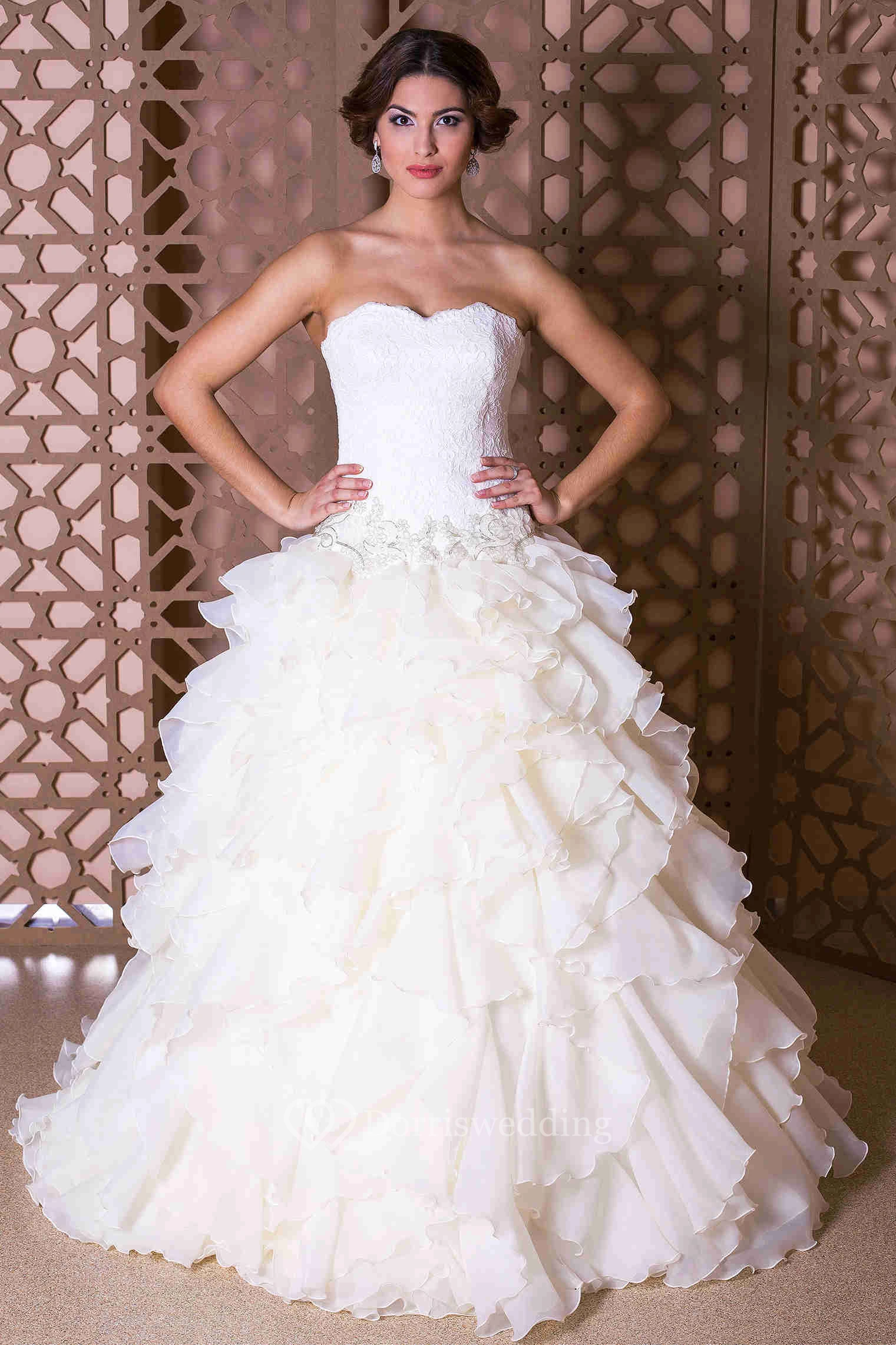 Ball Gown Strapless Jeweled Organza Wedding Dress With Cascading Ruffles And Lace