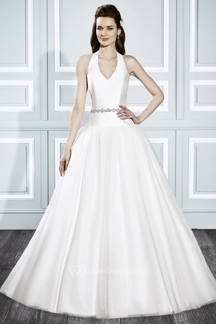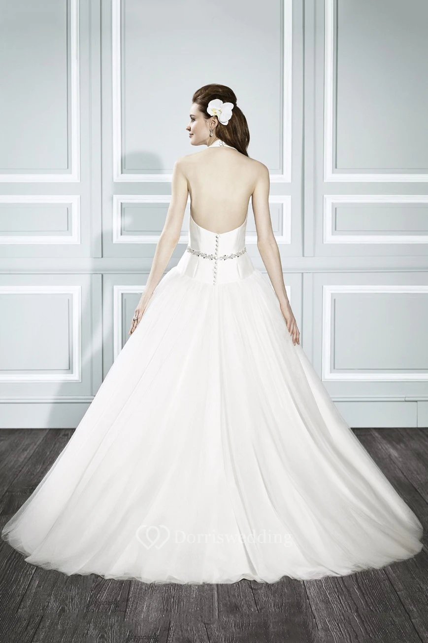 Ball-Gown Strapless Jeweled Sleeveless Long Satin Wedding Dress With Court Train And Backless Style