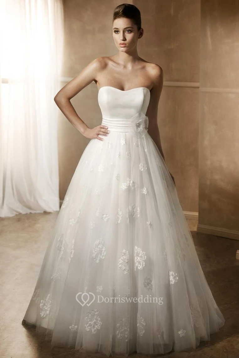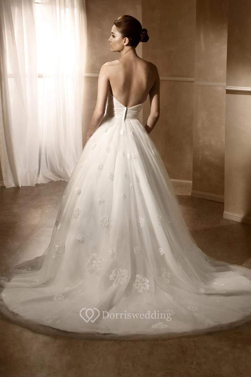 Ball Gown Strapless Long Tulle&Satin Wedding Dress With Appliques And Deep-V Back