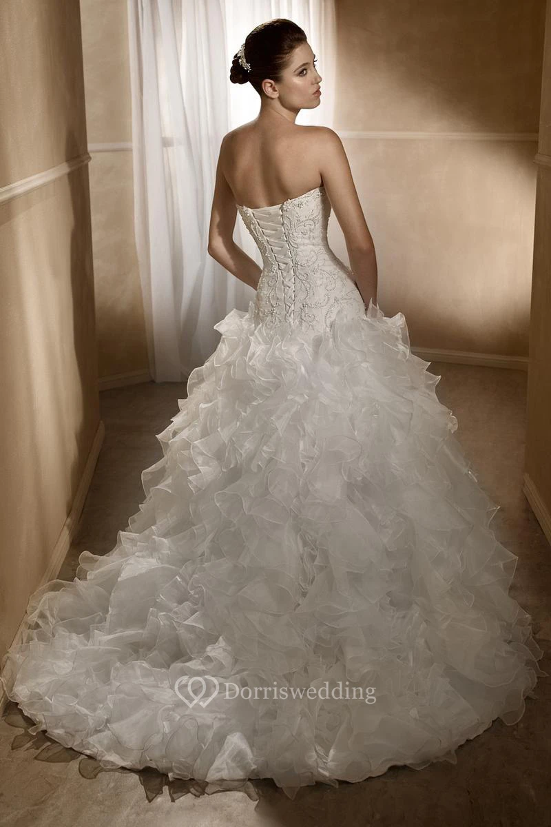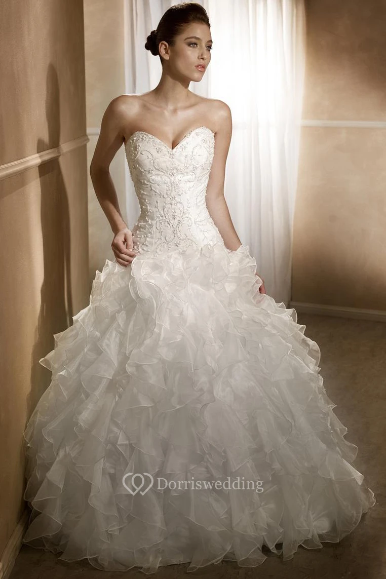 Ball Gown Sweetheart Floor-Length Beaded Organza Wedding Dress With Cascading Ruffles And Corset Back