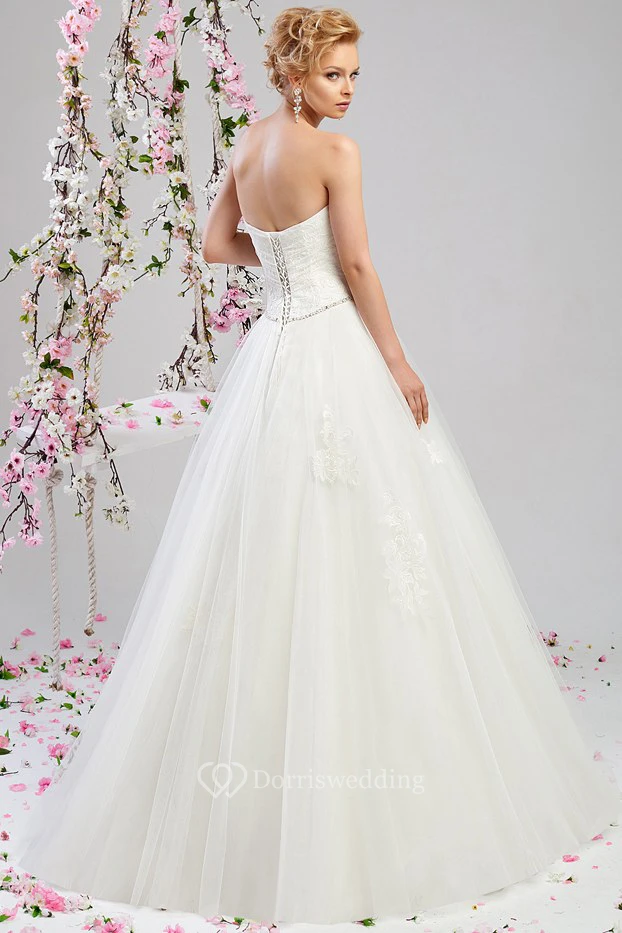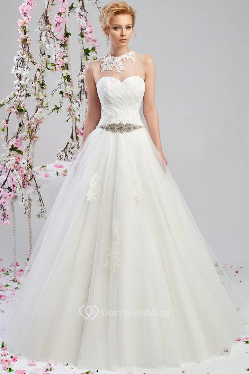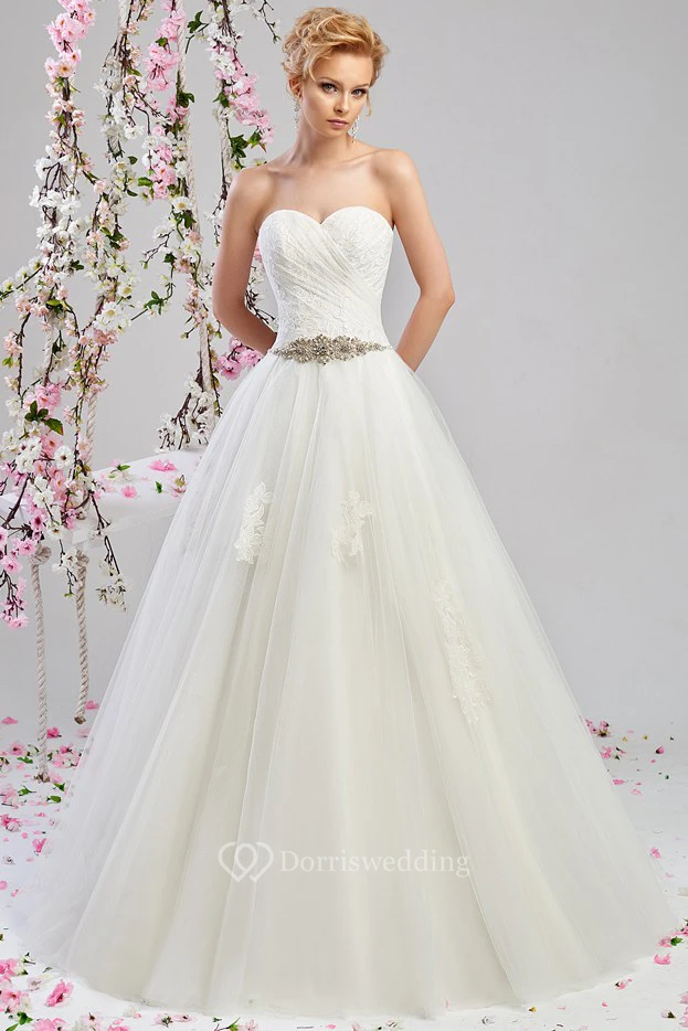 Ball Gown Sweetheart Floor-Length Criss-Cross Sleeveless Tulle Wedding Dress With Appliques And Waist Jewellery