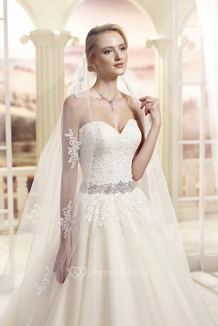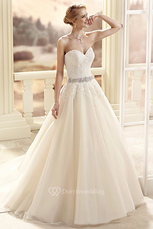 Ball Gown Sweetheart Floor-Length Jeweled Tulle&Lace Wedding Dress With Appliques And Court Train