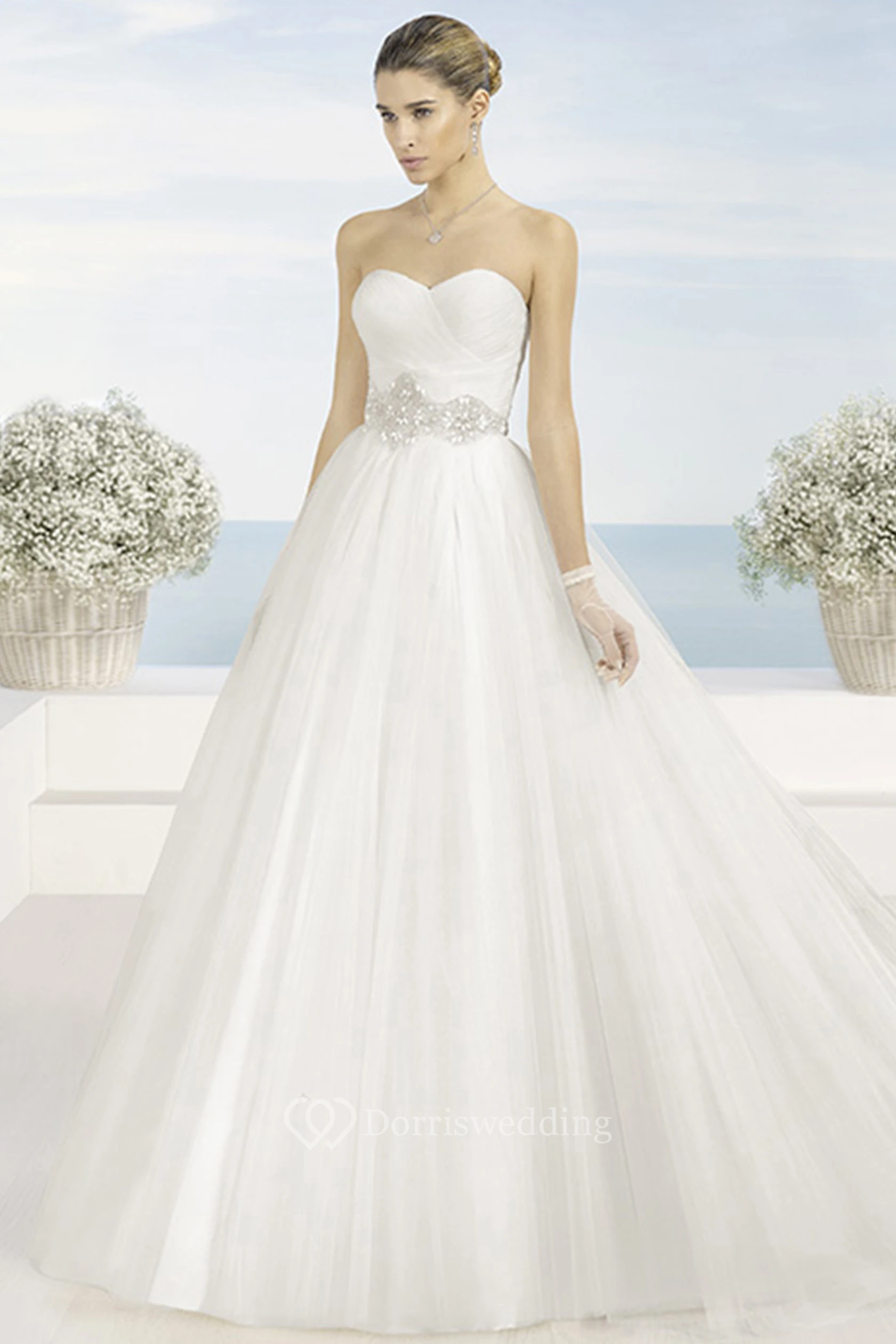 Ball-Gown Sweetheart Sleeveless Criss-Cross Floor-Length Tulle Wedding Dress With Waist Jewellery