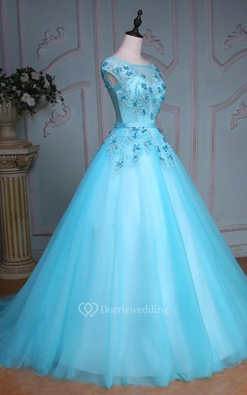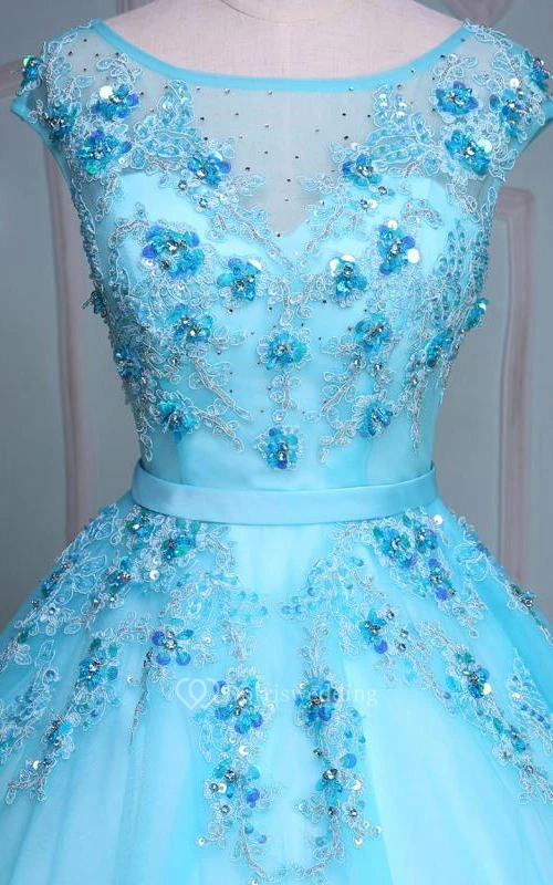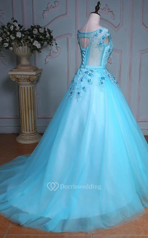 Ball Gown Tea-Length Bell Cap Bat Beading Appliques Court Train Corset Back Tulle Lace Sequins Dress