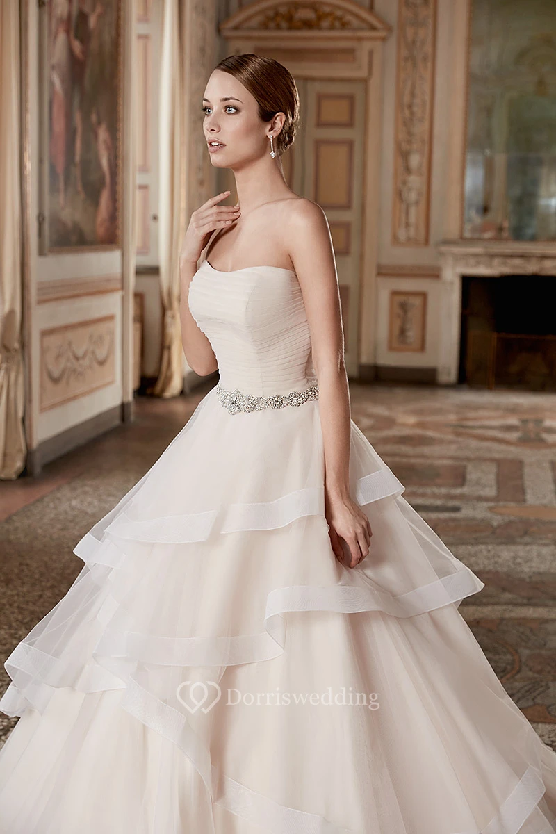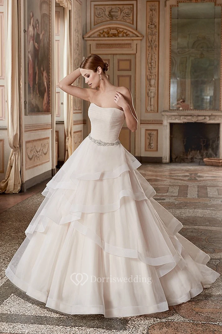 Ball Gown Tiered Strapless Floor-Length Sleeveless Organza Wedding Dress With Ruffles And Waist Jewellery
