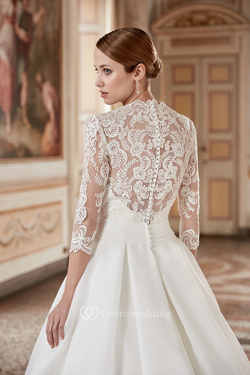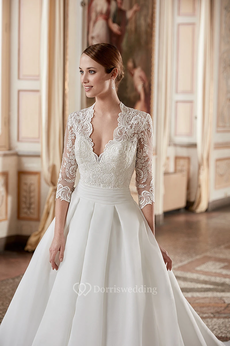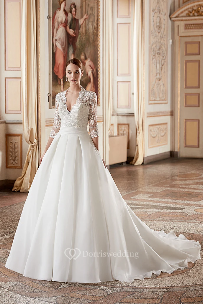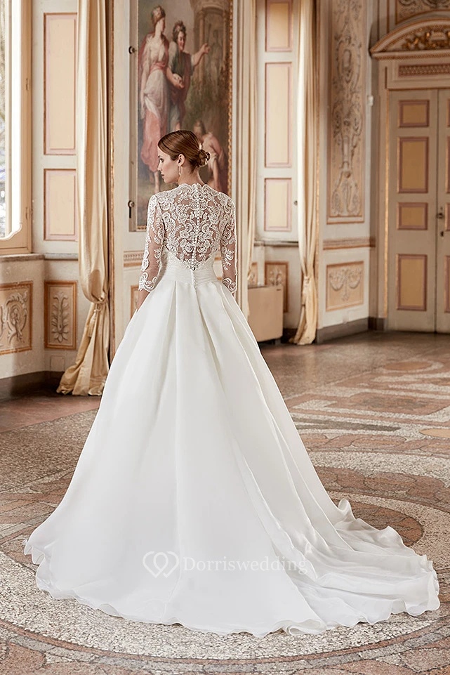 Ball Gown V-Neck 3-4-Sleeve Organza Wedding Dress With Illusion