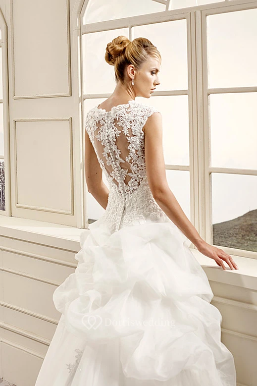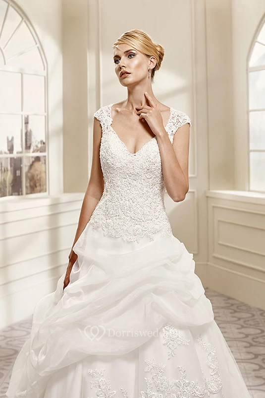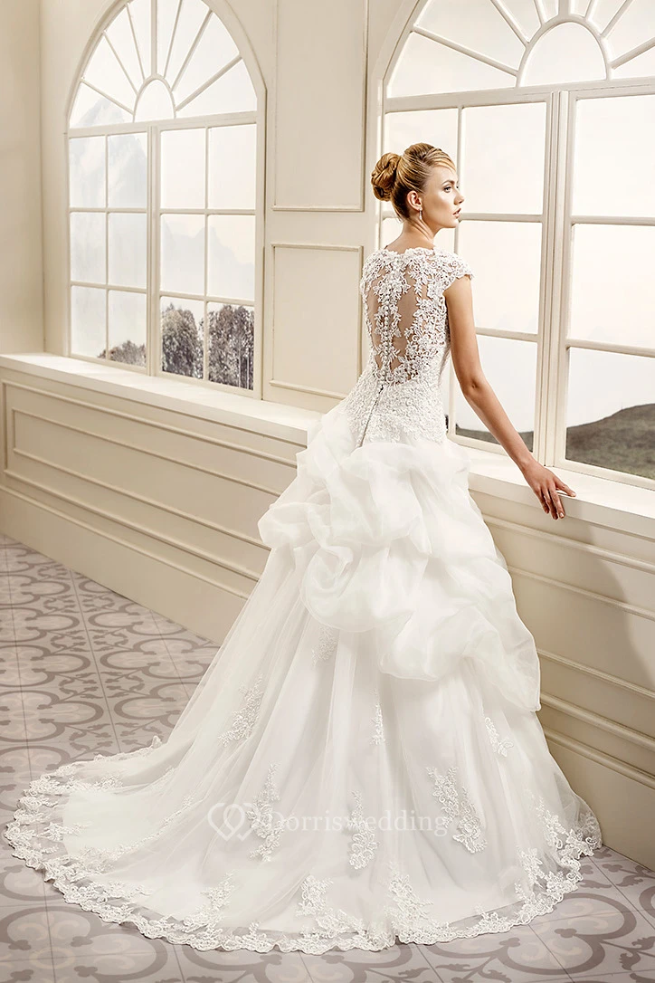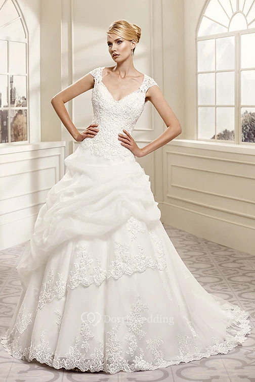 Ball Gown V-Neck Cap-Sleeve Organza&Lace Wedding Dress With Illusion