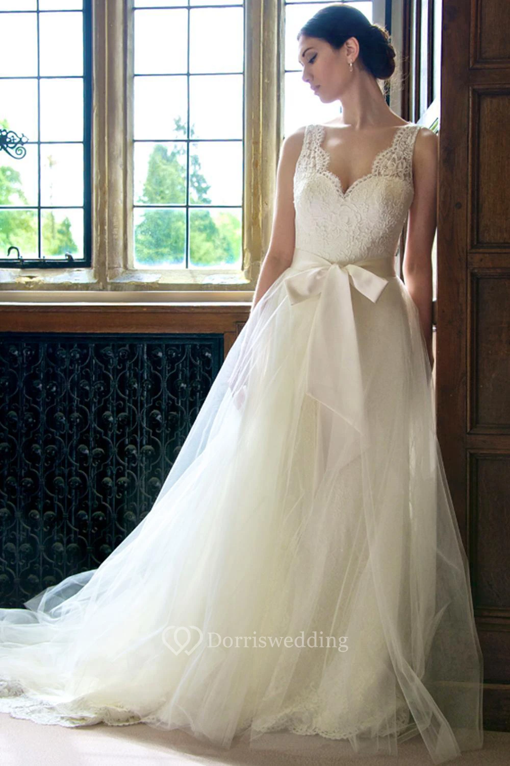Ball Gown V-Neck Long Sleeveless Lace Tulle Wedding Dress With Bow And Ruffles