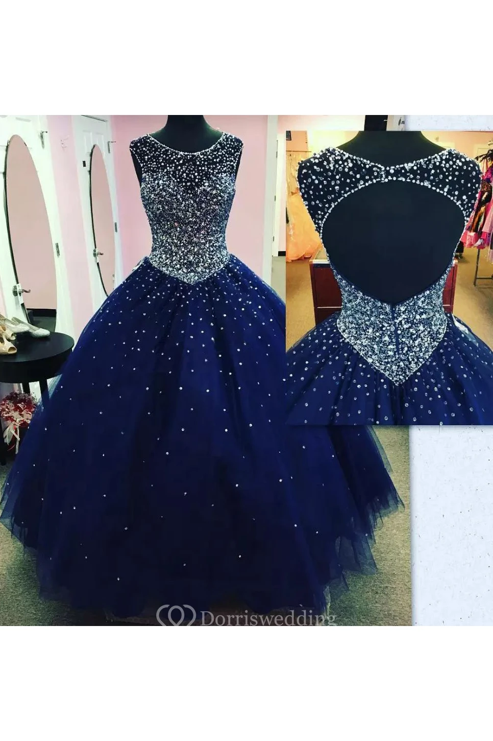 Bateau Ball Gown Floor-length Sleeveless Tulle Prom Dress with Zipper Keyhole Back
