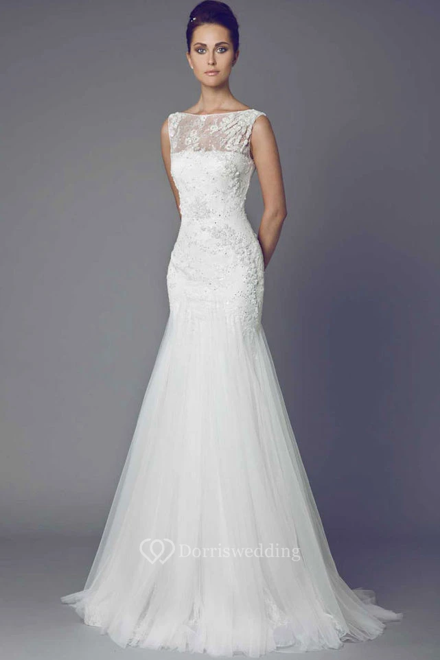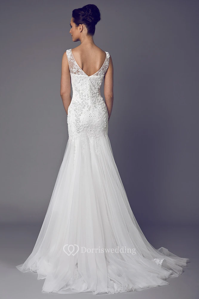 Bateau Floor-Length Appliqued Tulle Wedding Dress With Brush Train And V Back