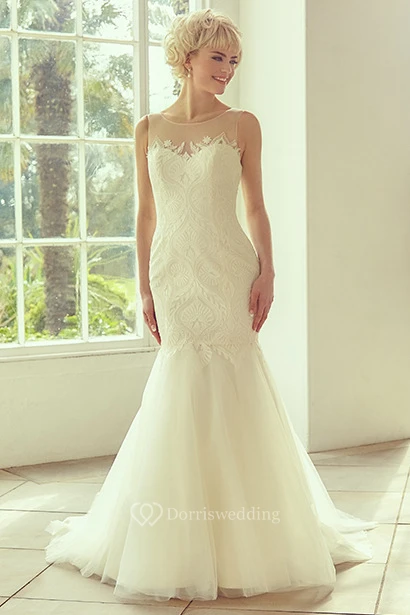 Bateau Floor-Length Appliqued Tulle Wedding Dress With Court Train And Illusion