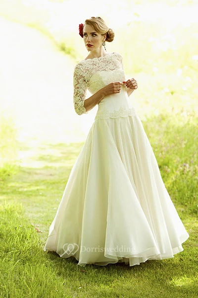 Bateau Floor-Length Lace 3-4-Sleeve Chiffon Wedding Dress
