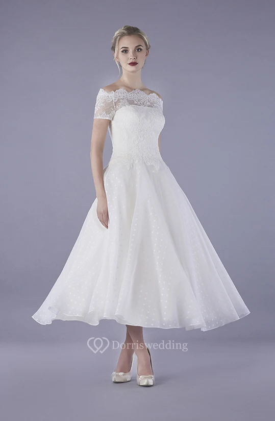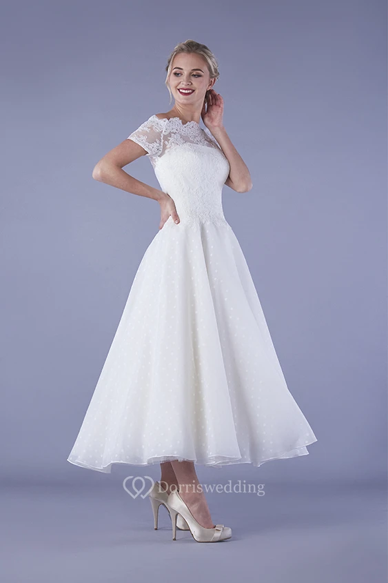 Bateau Illusion Lace Ankle Length Vintage Tulle Wedding Dress With Buttons
