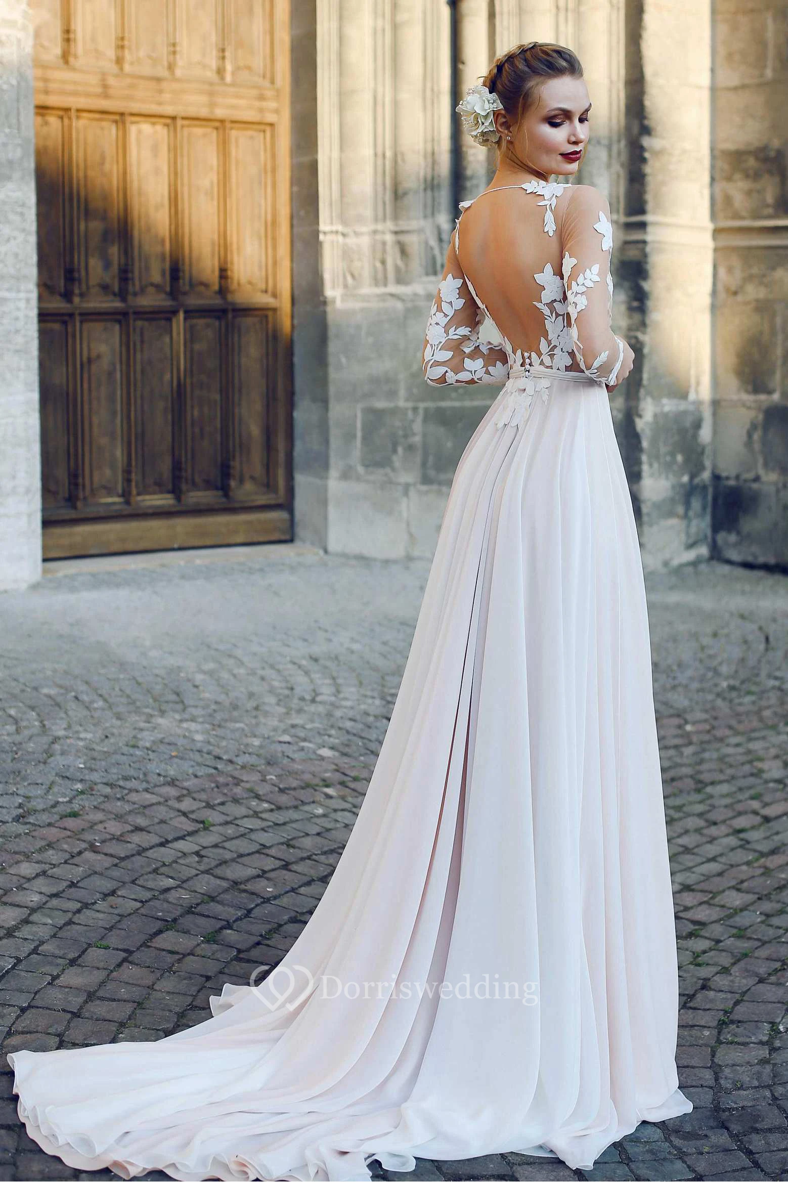 Bateau Illusion Long Sleeve Appliqued A-Line Chiffon Elegant Wedding Dress