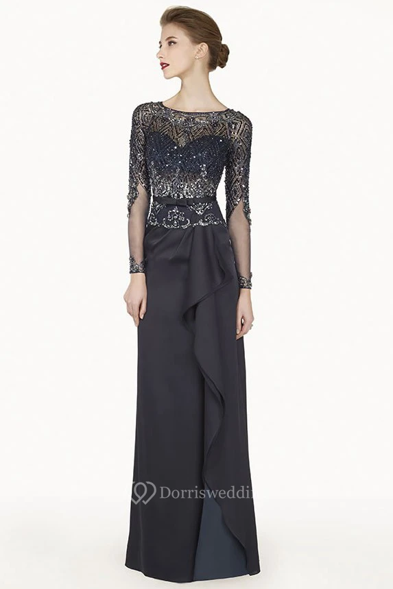 Bateau Illusion Long Sleeve Satin Long Prom Dress With Cascading Skirt