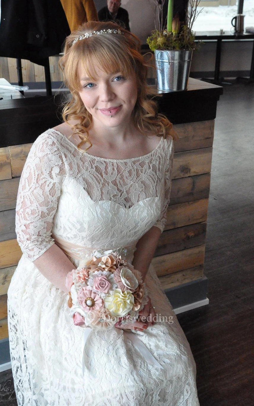 Bateau Illusion Sleeve Deep-V Back Lace Wedding Dress With Sash And Sequins