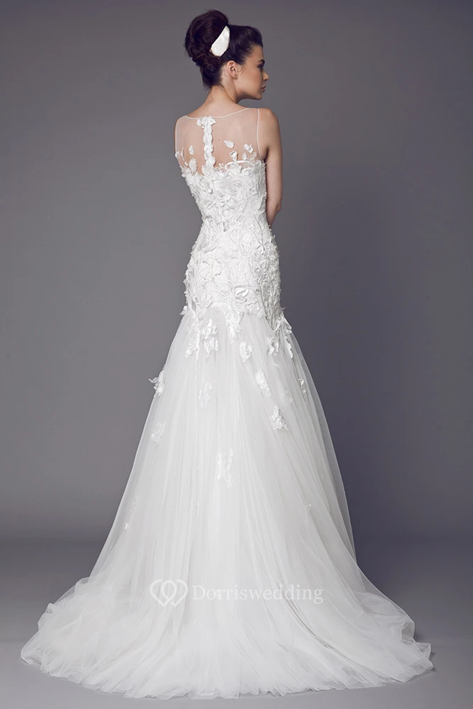 Bateau Long Appliqued Tulle Wedding Dress With Court Train And Illusion