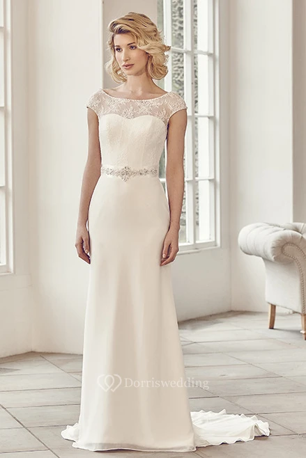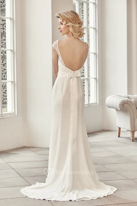 Bateau Long Bowed Appliqued Chiffon Wedding Dress With Sweep Train And V Back