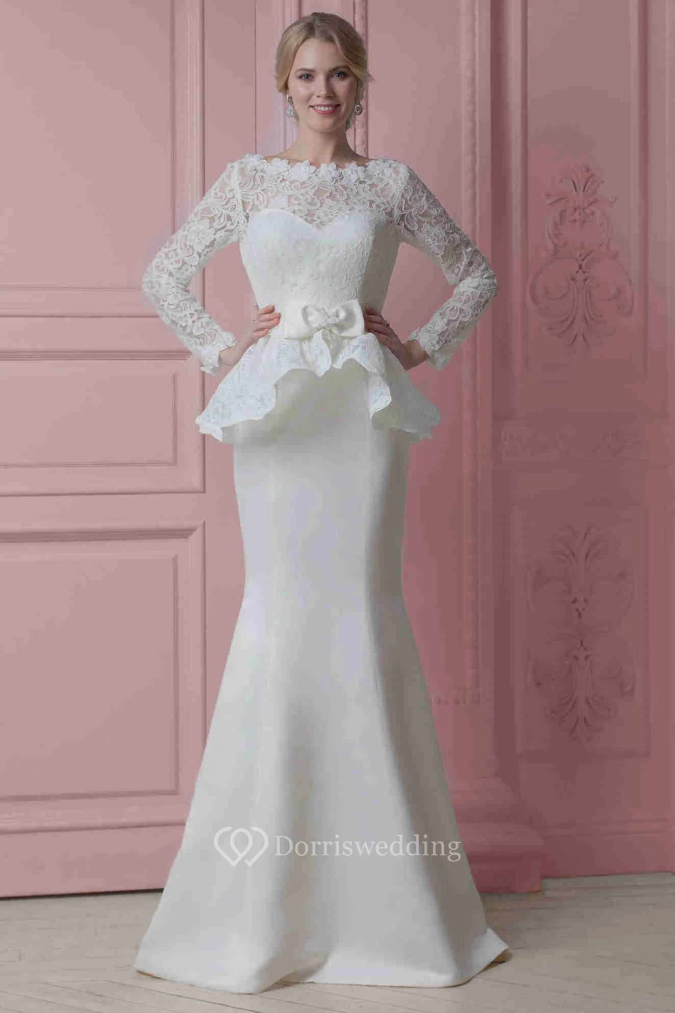Bateau Long Lace Peplum Satin Wedding Dress With Chapel Train And V Back