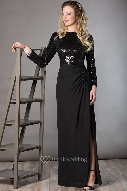 Bateau Long Sleeve Sequin Top Chiffon Long Mother Of The Bride Dress With Side Split