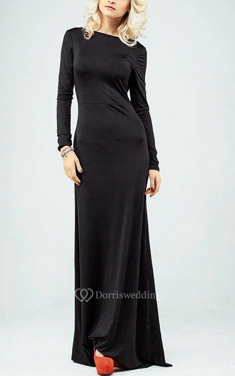 Bateau Long Sleeve Sheath Jersey Long Dress With Dropped Open Back