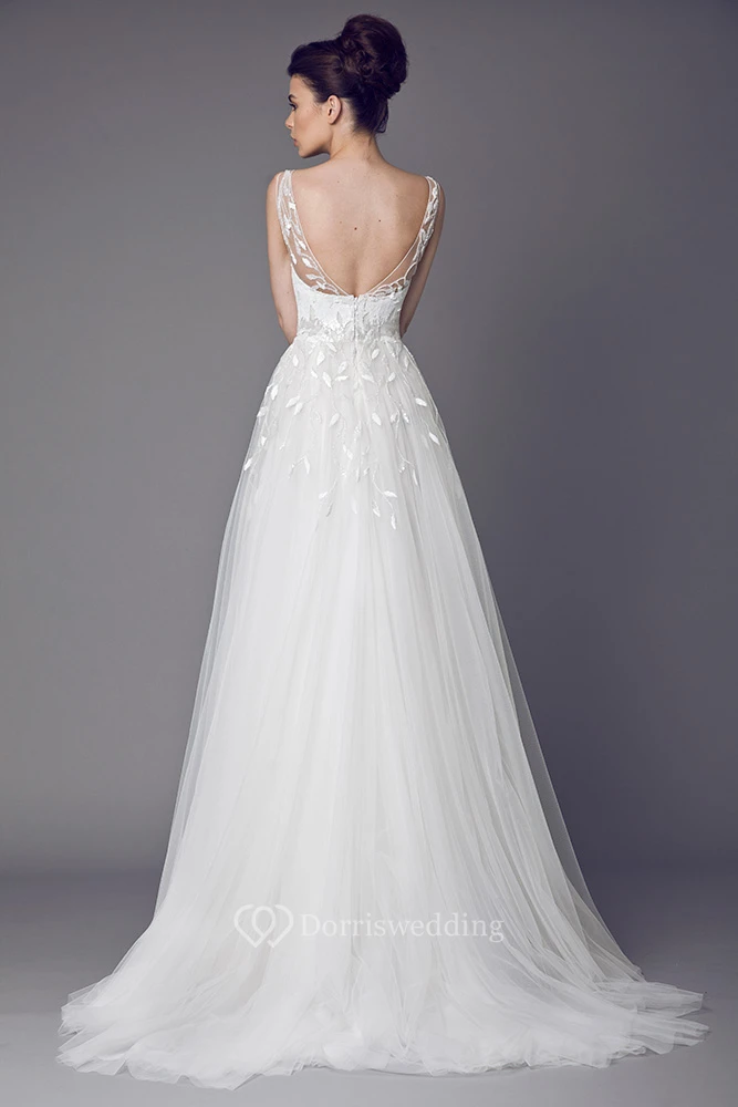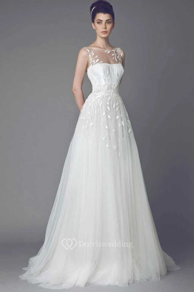 Bateau Maxi Appliqued Tulle Wedding Dress With Sweep Train And V Back