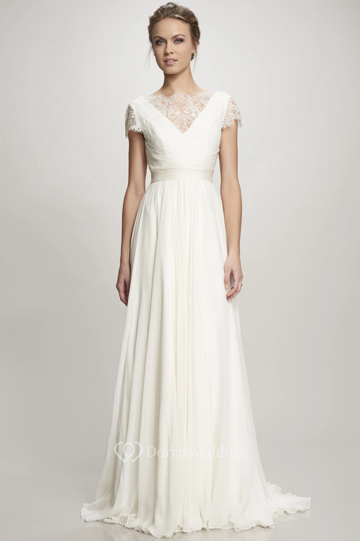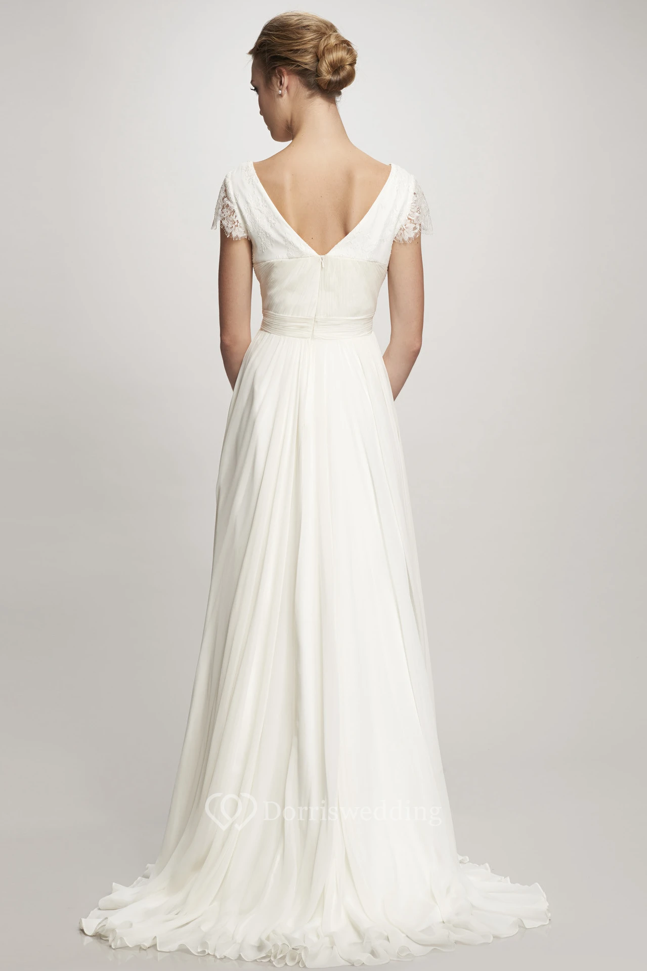 Bateau Maxi Ruched Cap-Sleeve Chiffon Wedding Dress With Sweep Train And V Back