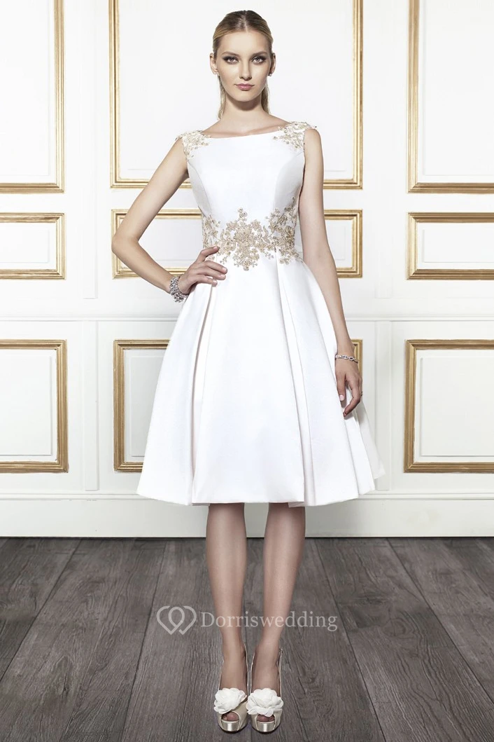 Bateau Midi Appliqued Satin Wedding Dress With V Back
