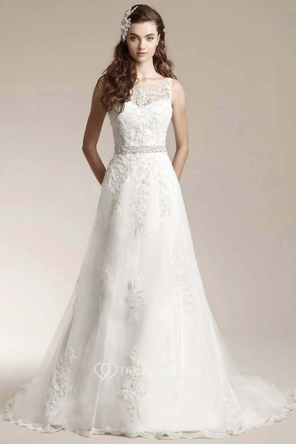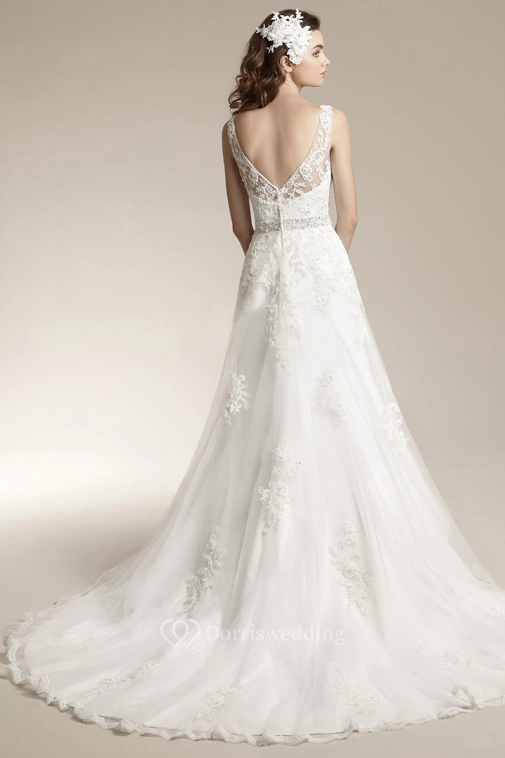 Bateau-Neck A-Line Long Wedding Dress With Appliques And Low V-Back