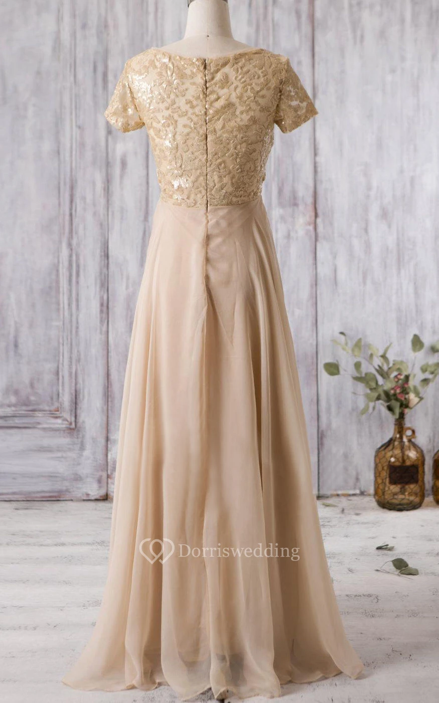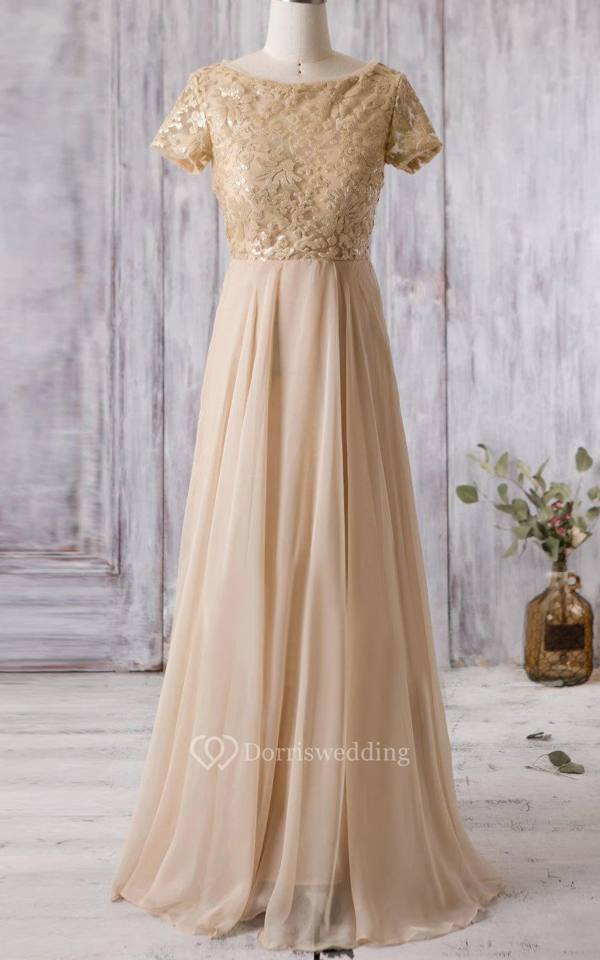 Bateau Neck A-line Pleated Chiffon Long Dress With Lace Bodice